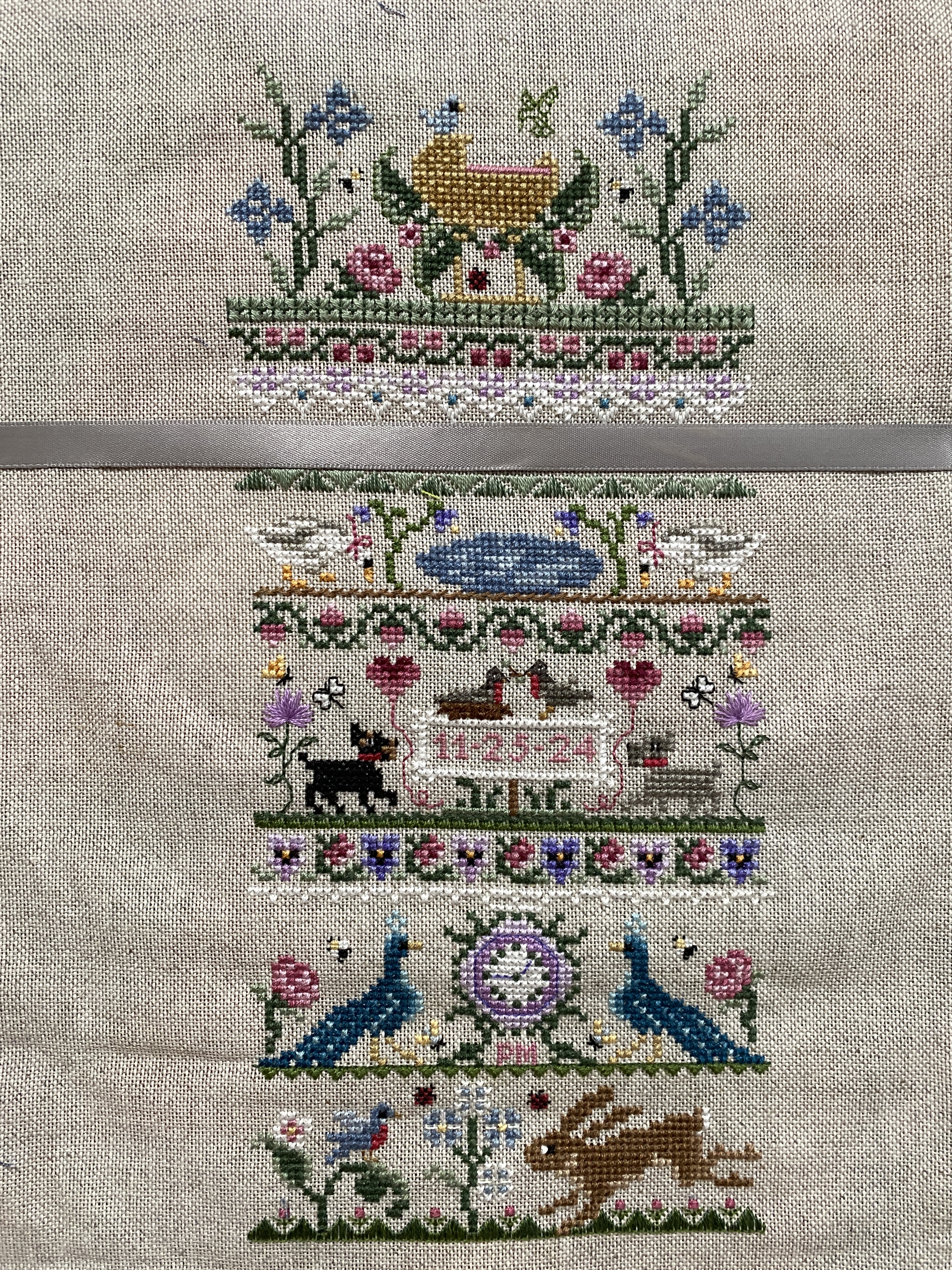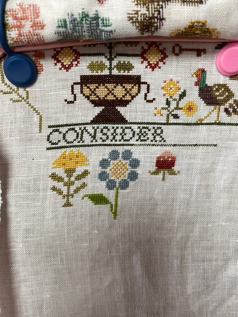 Wednesday: No quilting or sewing was done. I spent the whole day cleaning out my garage. I clocked 22,704 steps doing it, almost nine and a half miles. I still have work to do on it, and a bunch of stuff to re-home or safely dispose of. I did manage a bit of cross stitching, I re-started the Consider the Lillies piece, I sewed the word “Consid–” before I went to sleep. I also measured the baby sampler for a mat and frame and got those ordered too. Thursday will be a bit more productive in the studio.