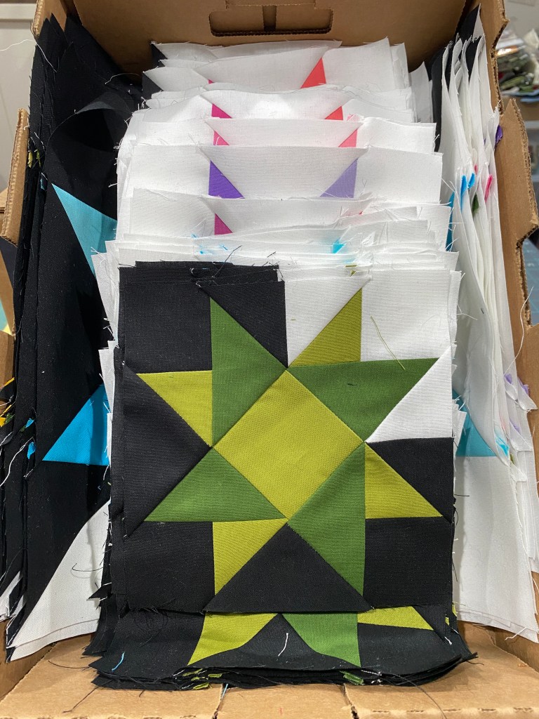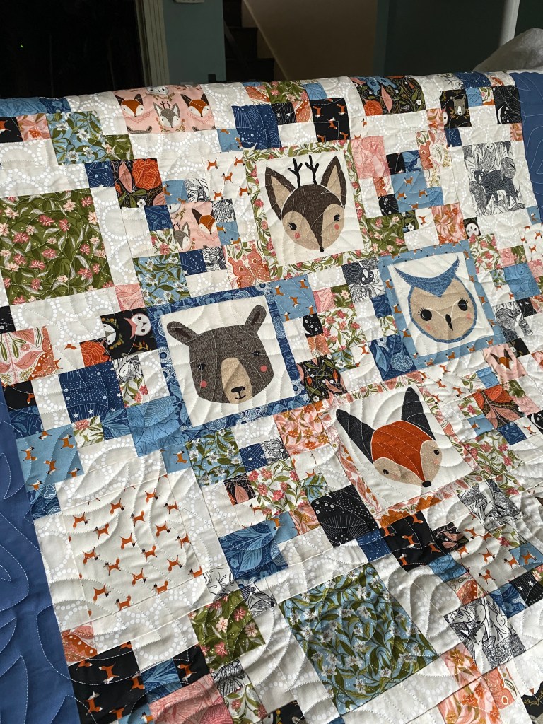 Tuesday: I finished the yellow #2s and the green #2s, making 16 blocks today. After that I trimmed and bound the two customer quilts I had finished long-arming. I received the quilt kit for another customer in the mail this morning. It’s pretty simple, a yellow brick road pattern with some really nifty halloween prints. I’ll start that soon, maybe do a few more quandary blocks. I finished the baby sampler, including the reduced size humming bird, yay! And I finished the woodland friends quilt on the LA. Might bind it tomorrow, but I have to make some binding first. Also bought two digital quilting designs for the Licorice and Lollipops quilt. I want to quilt it next, before I forget my “vision” for it.