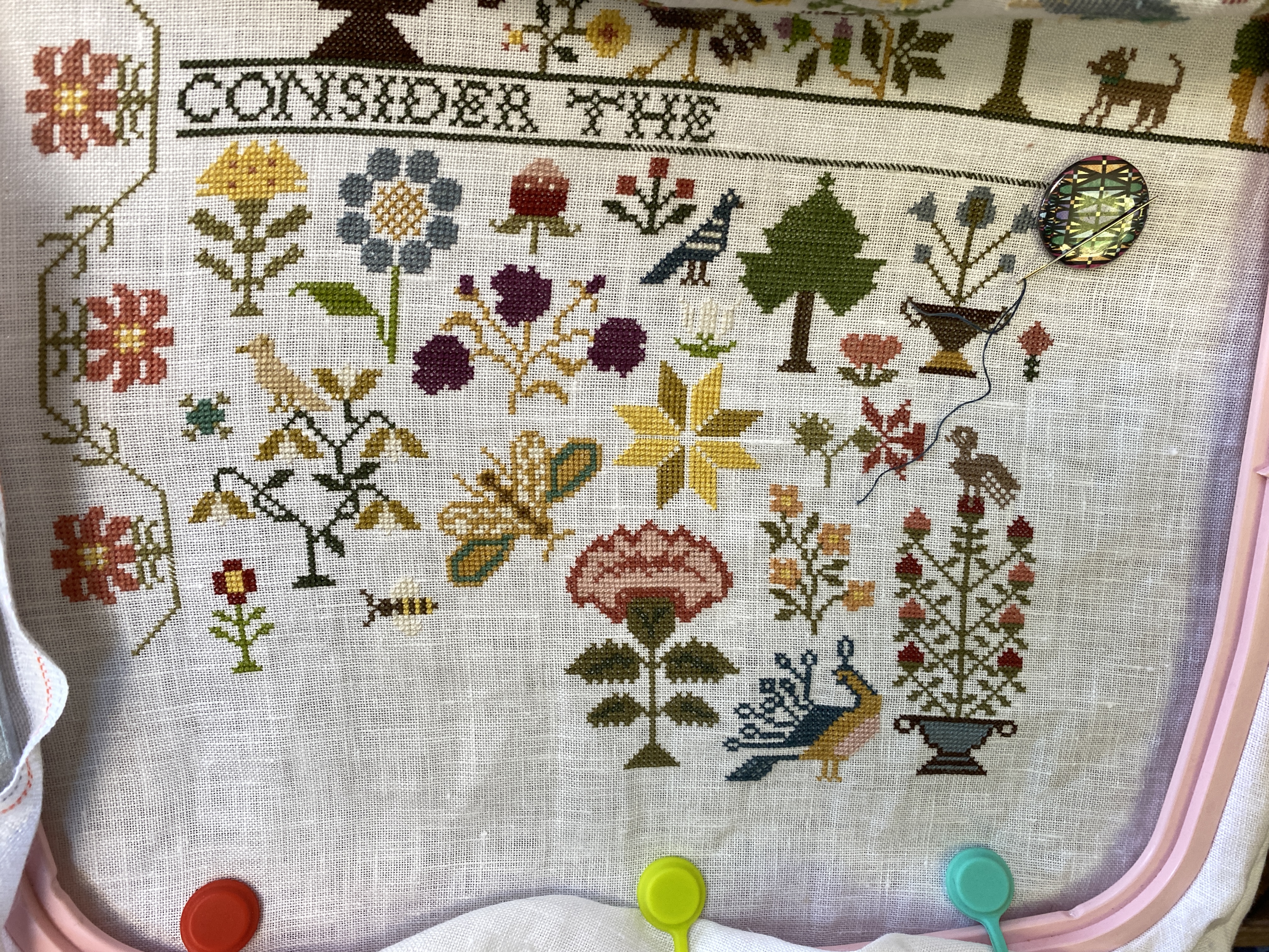 Lillies of the field has gotten a few more stitches. I worked on the peacock last night, this corner needs a few more motifs and the border. I should work on bringing the border around the corner. Looking back, I started this project in August 2023, after completing the Heaven and Nature sampler. In between, I finished the Fabulous Houses, the Manor, and a Baby Sampler. I really want to finish this, and start a smaller piece. I enjoy being a monogamis-tic cross stitcher, but I do have a back log of kitted up projects.