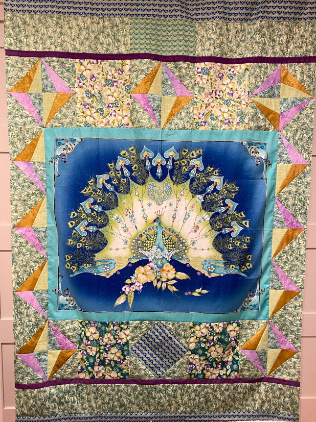 I got fabric delivered today, some more Thomas the Tank engine prints and some more Peter Rabbit prints for baby quilts. Also a few Bella solids to fix the peacock panel quilt that has been languishing since 10/24. I want to give the border a bit more color and structure, right now they look blurred to me. The center panel just pops out at you and then the borders are sort of wishy-washy. Looking at the old photo, I see one block is turned the wrong way – sigh.