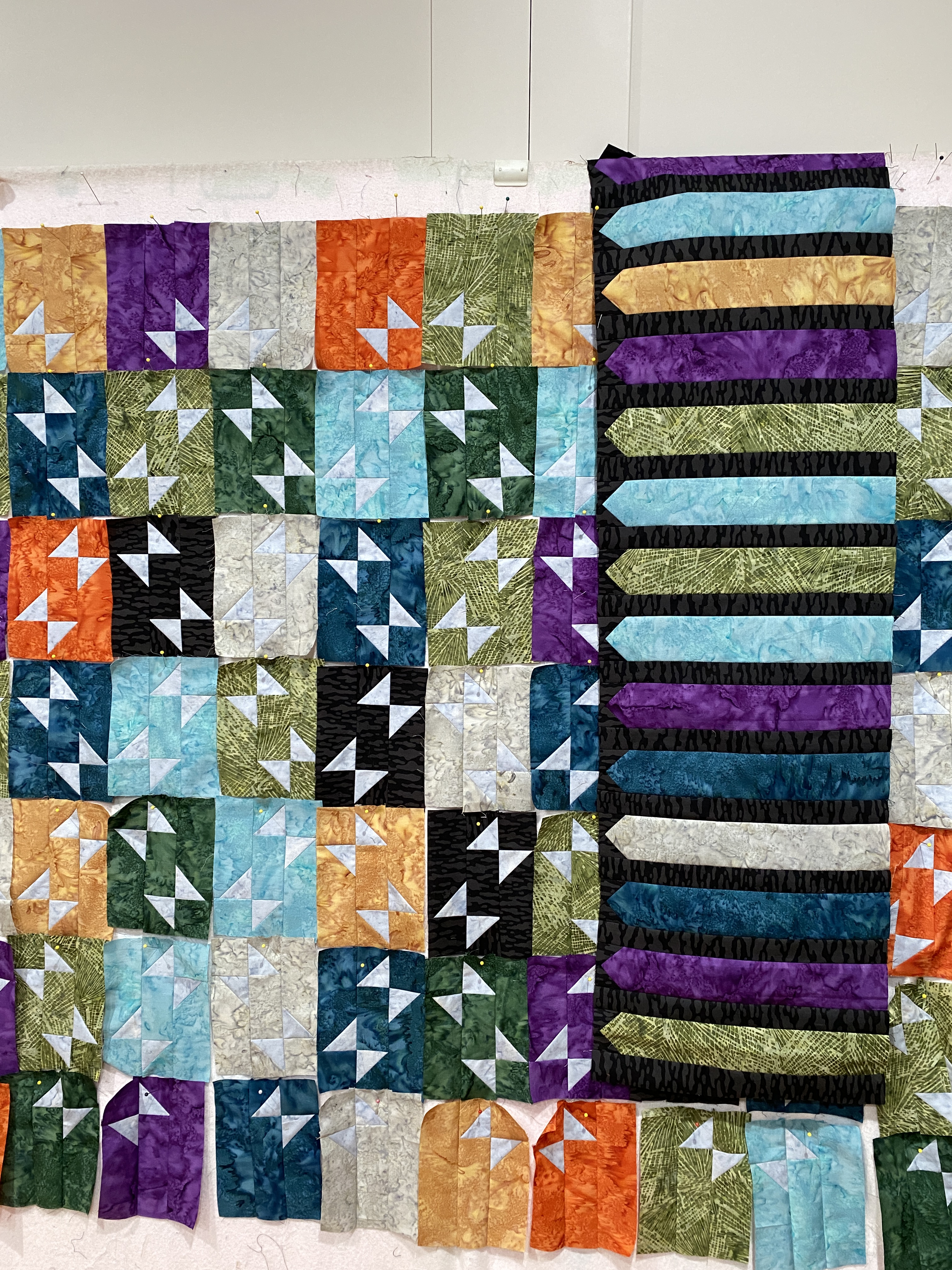 This week I have been working on putting together the eigth Halloween quilt of 2025. I think I am done with orange and black for a while. The Happy’s Place quilt is all jewel tones, so it’s nice not to have to do O&B. I did manage to mess up the 25 “B” blocks and had to re-make them all. I persevered and didn’t make any errors on the “A” and “B” border blocks. I am hoping to get the main part of this quilt together and work on the borders this weekend. I am still not sure I like the wonky stars and geese. It is hard for me to do wonky on purpose, I like precision in all things pointy. Maybe I should look at it as a challenge, or would that be an anti-challenge?