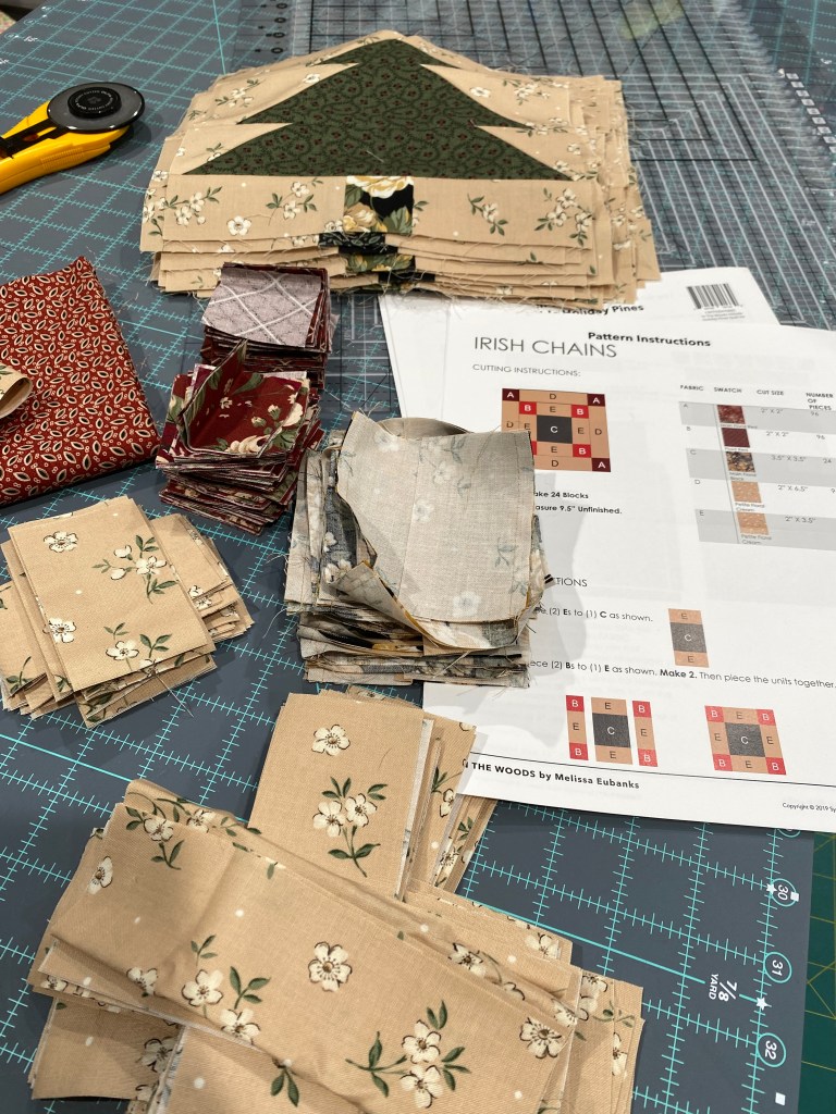 The Country Christmas/ Plaid Pines quilt is coming along. I got the 25 tree blocks done, and the pieces for the log cabin blocks done. Lots of chain piecing and it’ll come together quickly. I don’t think I have mentioned the Extra Large Stripology rule I got recently. It is quickly becoming a favorite, it is a bit faster than the Accuquilt cutter, and much easier to set up and use. It has made the cutting for this quilt go so fast. The layer cakes I ordered for the Evergeen quilt came in. I need to check and see if I can use the 108″ snowflake fabric I have as a background. I bought a bolt of it last year, thinking I would use it for the custom order I had. The Client didn’t like it, so I need to use it up.