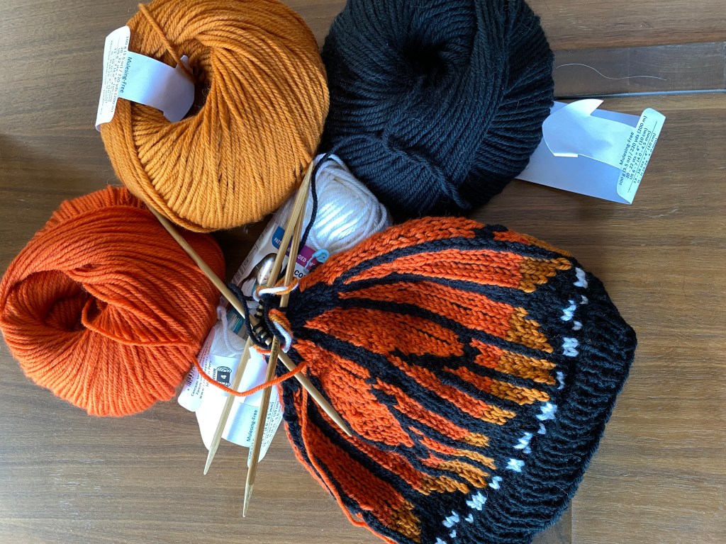 I speed-knit this Monarch wing hat yesterday. It was very easy, especially with a color chart, and worsted weight yarn. I may make another for a one year old I know, but use sport weight and smaller needles. I used 7’s for this, as the Ravelry reviews said it knitted up tightly with the recommended 5’s for the ribbing. I may make another adult size, as I did buy the beautiful Malabrigo yarns. I used Cascade for this one, and a remnant white acrylic I had in the bottom of my bag. I still have a bit of duplicate stitches to do, as a sort of blending between the oranges.