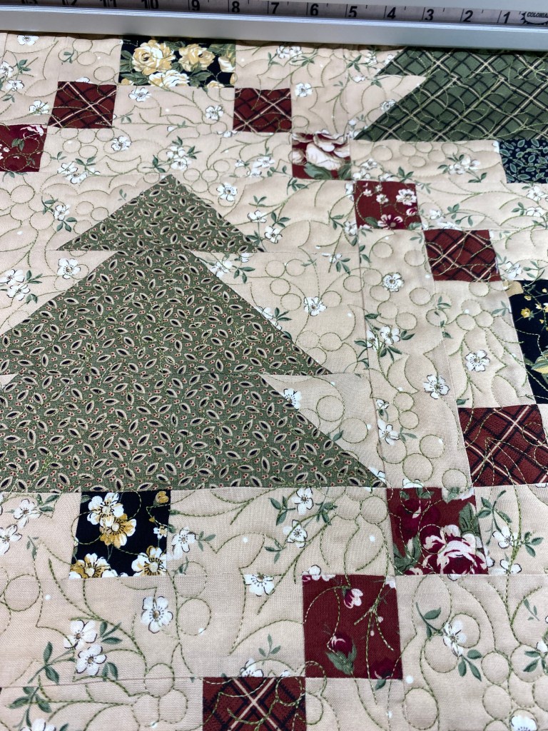 My current longarm adventure is taking a really long time to complete. I finished putting the Country Trees kit together the Friday after Thanksgiving and got it on the frame last weekend. I chose a Holly leaf and berry panto for it and got it started. About an hour into the first row, I regretted that choice. The panto looks great and stitches out smoothly, it just takes about two and a half hours to do a row. I am able to do other things while the machine works, I have another hat and a half finished. I think I need to make three more, for gifts.