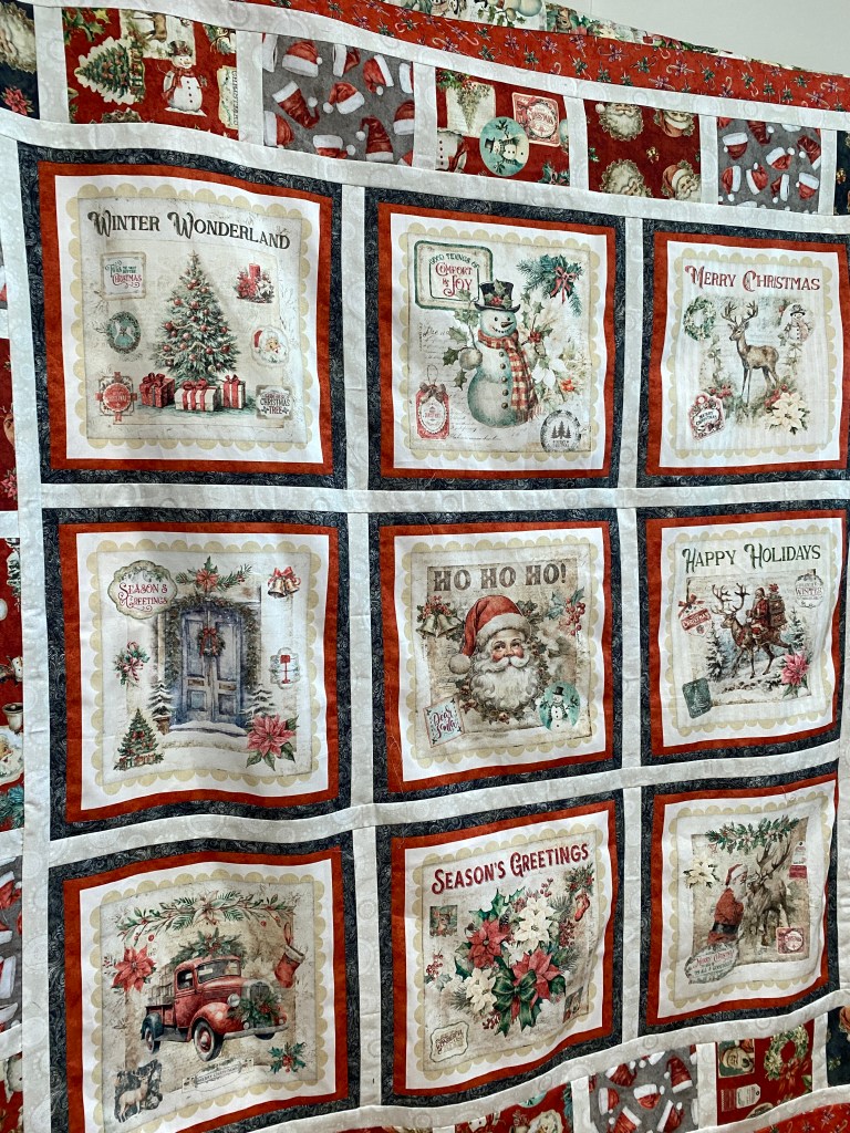 I have been working diligently to finish up gifts and quilts and shopping. I really need to get to the post office today, but first I need to gather all the things and pack them up. I did make a list, so thats a start. I have been getting the last Christmas themed quilt together, it was a kit from Backside Fabrics. I really like the fabric line, Holly Jolly from QT fabrics. Vintage looking Santas and ephemera of the 50’s and 60’s. Cozy and soft, I briefly entertained making another quilt from the scraps, I would have to buy more yardage though. Maybe after the holiday, during a sale or something. I just remembered that I was going to make the evergreen quilt with the layer cakes I bought back in November. The best laid plans for quilters and…