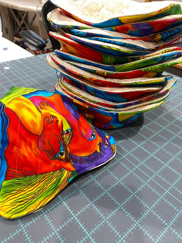 In a flurry of activity, I finished off the bowl cozies, and the tissue box covers. I was not really happy with the embroidery on these. The tension is off, and the bobbin thread was coming through to the top. I scrapped two, and tried using more stabilizer and matching the bobbin color. It looks better, but just okay. I also put the binding on the placemats, runner and throw I made using the Art Haus fabric line. The runner is pictured under the tissue box.