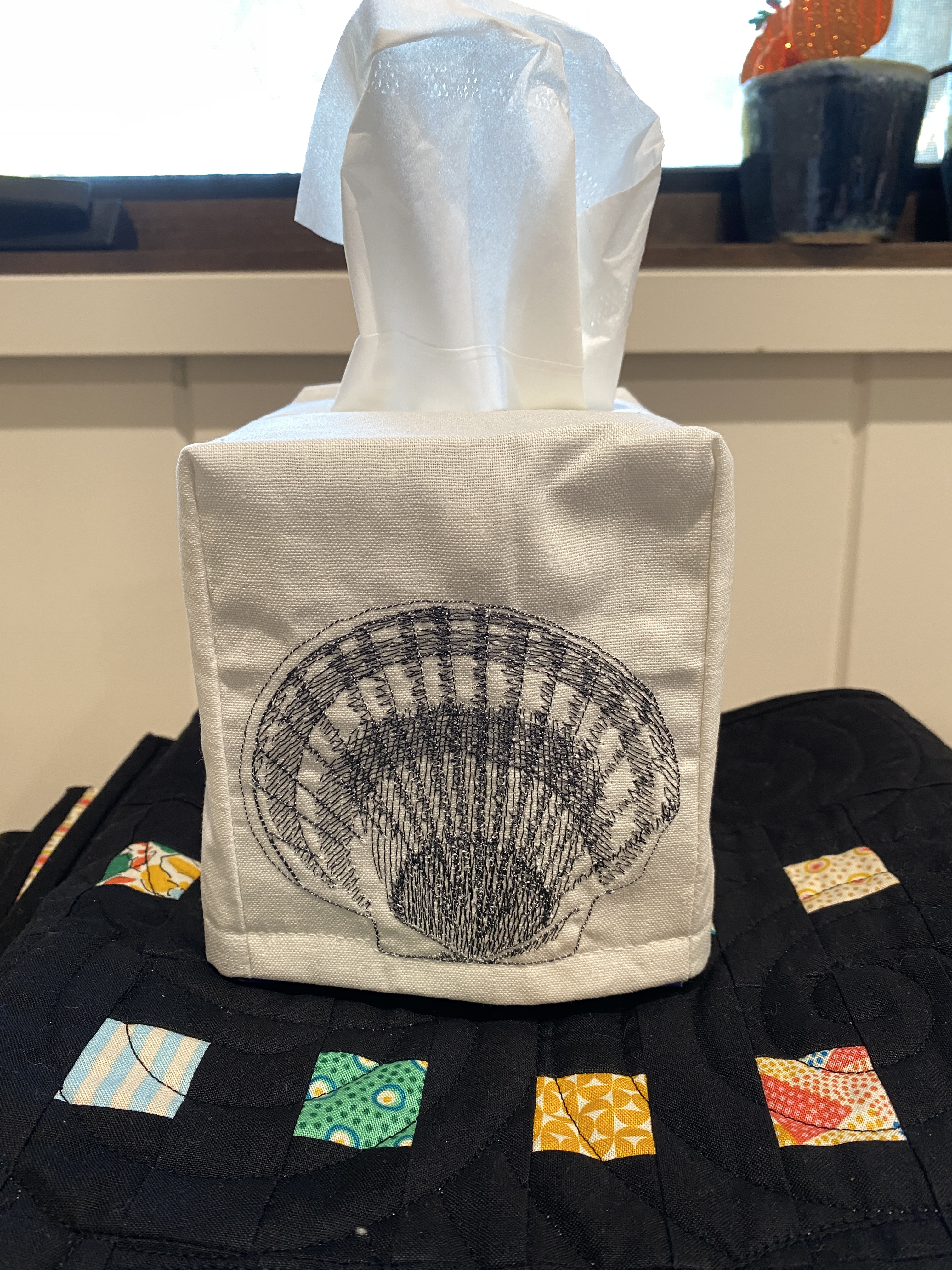 In a flurry of activity, I finished off the bowl cozies, and the tissue box covers. I was not really happy with the embroidery on these. The tension is off, and the bobbin thread was coming through to the top. I scrapped two, and tried using more stabilizer and matching the bobbin color. It looks better, but just okay. I also put the binding on the placemats, runner and throw I made using the Art Haus fabric line. The runner is pictured under the tissue box.