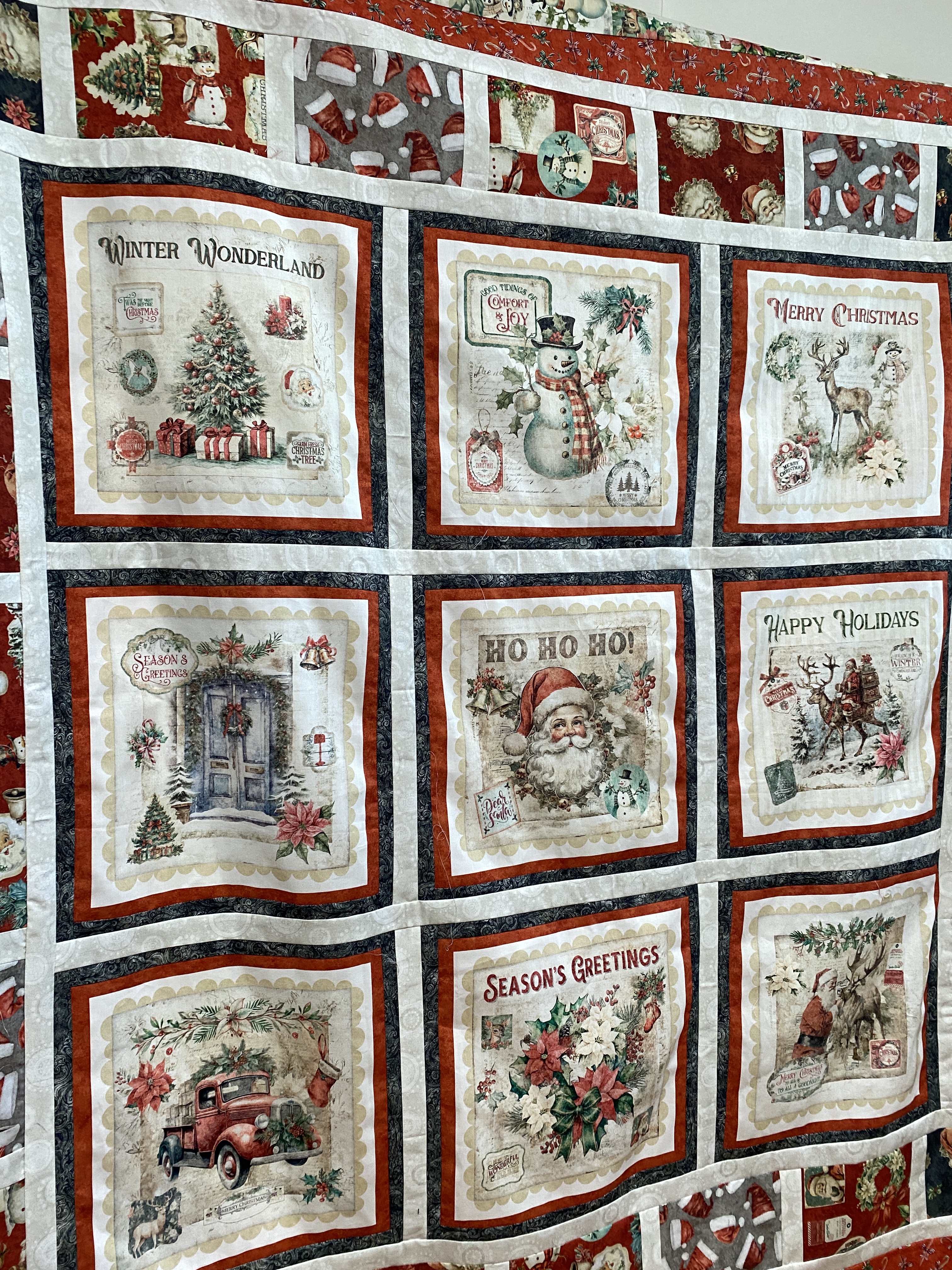 I have been working diligently to finish up gifts and quilts and shopping. I really need to get to the post office today, but first I need to gather all the things and pack them up. I did make a list, so thats a start. I have been getting the last Christmas themed quilt together, it was a kit from Backside Fabrics. I really like the fabric line, Holly Jolly from QT fabrics. Vintage looking Santas and ephemera of the 50’s and 60’s. Cozy and soft, I briefly entertained making another quilt from the scraps, I would have to buy more yardage though. Maybe after the holiday, during a sale or something. I just remembered that I was going to make the evergreen quilt with the layer cakes I bought back in November. The best laid plans for quilters and…