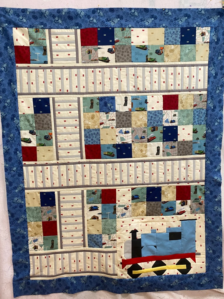 One Thomas the Tank quilt top is done, I got the train block done for the second. I want to make two of these quilts. The kit had enough of the prints, I just had to get a few yards of the white and red print, and the grays for the track blocks. The tracks are a bit of a pita to piece, mine came out ½” too short, you really have to use a scant quarter inch seam for all those skinny strips.