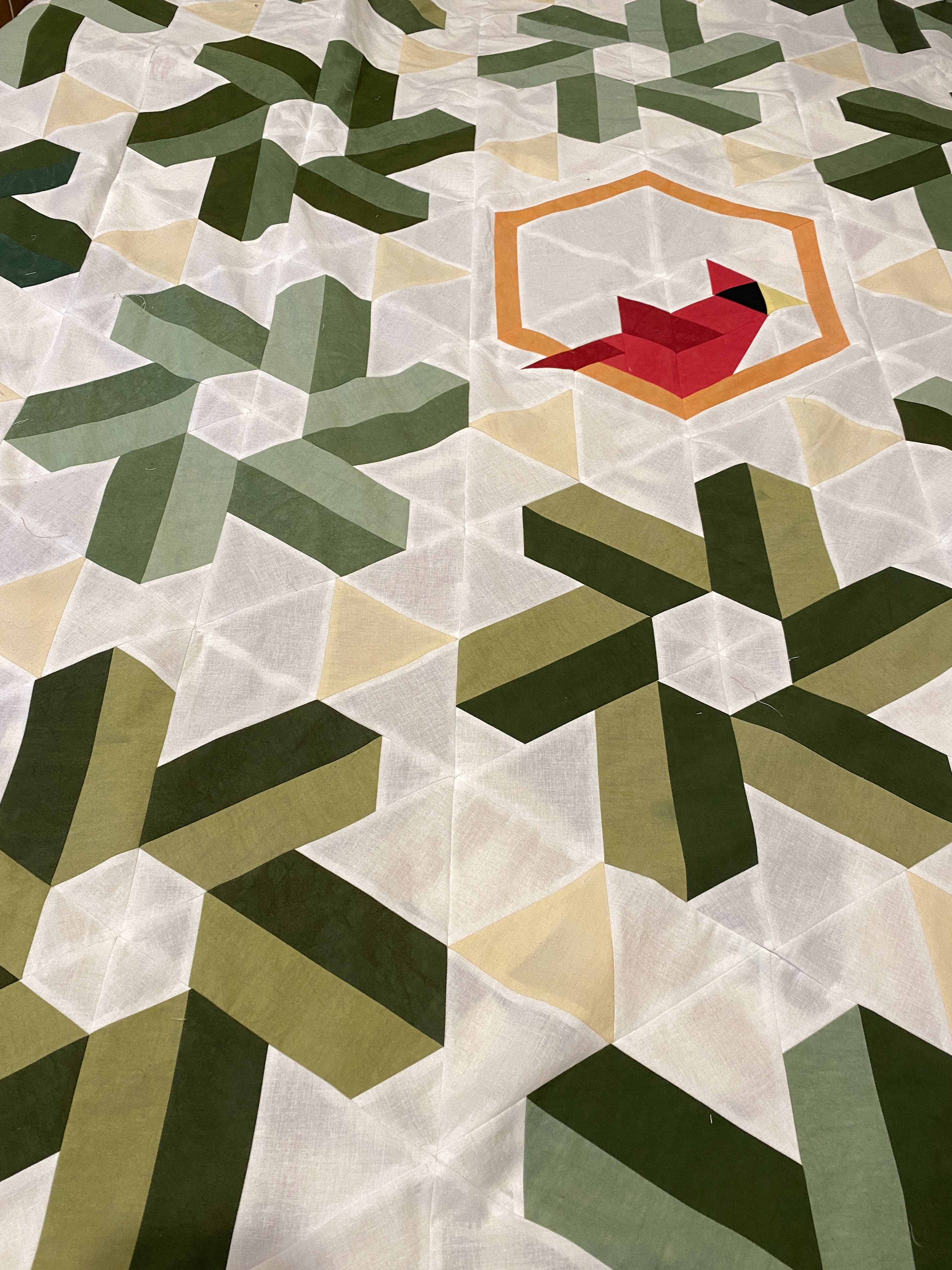 I finished and bound the last Christmas quilt and took a few pictures of it with the tree in the background. I got the placemats (the ones I added on to the extra backing) cut, still have to bind them though. The second Peter rabbit quilt is quilted and I was able to fit the mini rings quilt on the end of that backing. Those two need trimming and binding. I got the Quandary quilt loaded and started yesterday, its huge 102 x 102. My favorite finish is the Blooming beauties BOM top. I persevered and over two days sewed it all together, actually completing it in 10 months – it was a 9 month block(s) of the month. I didn’t get a picture of it after I ironed it, but it looks the same as the cover photo. I also got the Winter Visitor quilt top done, I would like to get it quilted soon, I found a really cute cardinal panto to use.