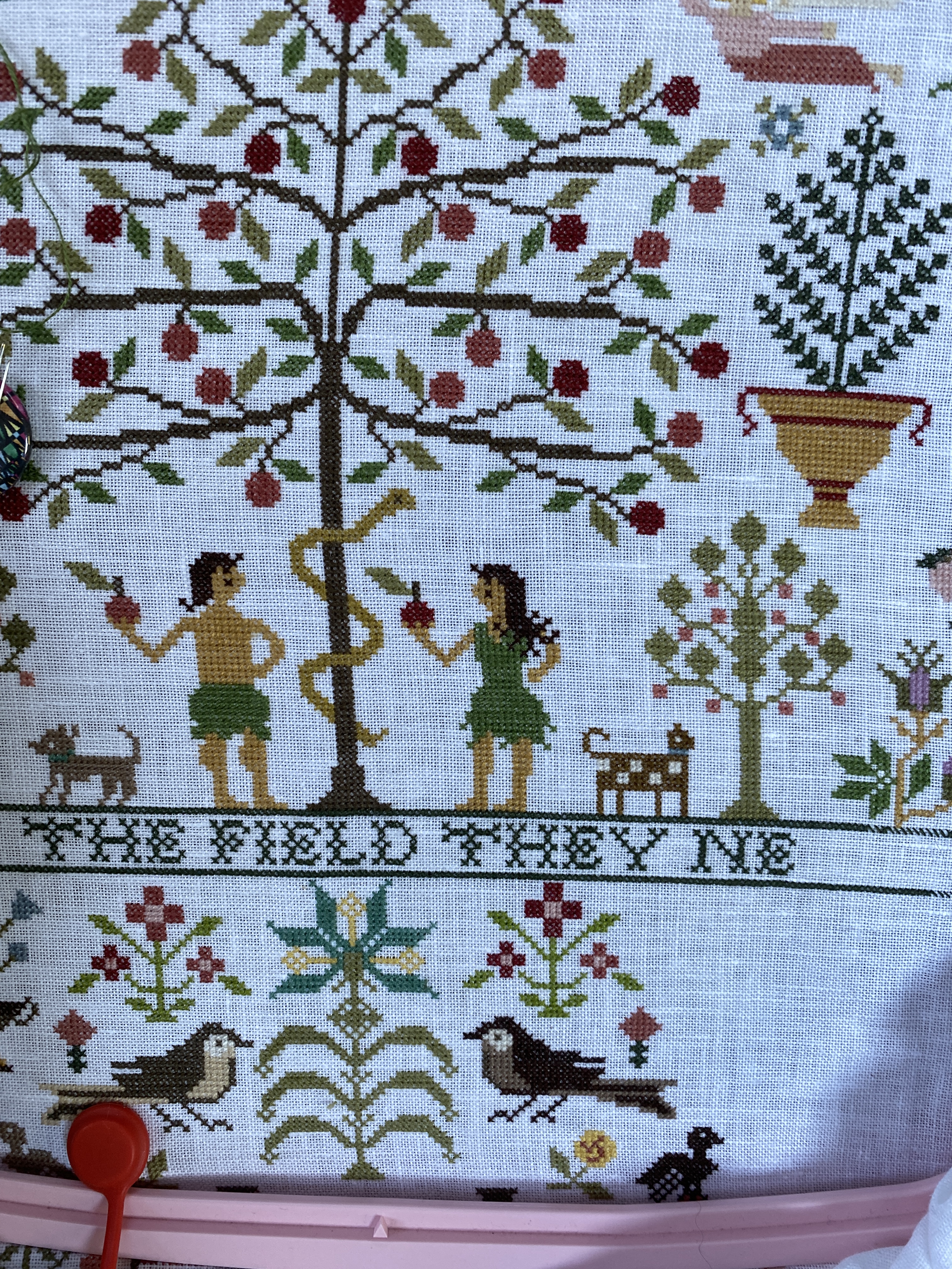 Consider the Lilies got stitched on a bit too. I finished all the bricks, just need the grout lines, and I “wrote” a few more words in the verse. I am feeling the down slope of this project, YAY!