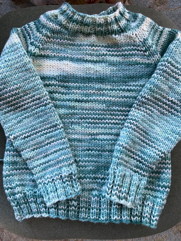 Finally, I finished the hat baby sweater. It started out as a hat, but I was using worsted weight, I thought it was going to be okay for an adult sized hat, ha, more like a tea pot cozy. 120 stitches is too many in that yarn size for a hat. However, I was able to find a bottom up knitted raglan sleeve kids sweater pattern. I think it turned out pretty well, the yarn isn’t the best, but for an everyday washable sweater it’ll do.