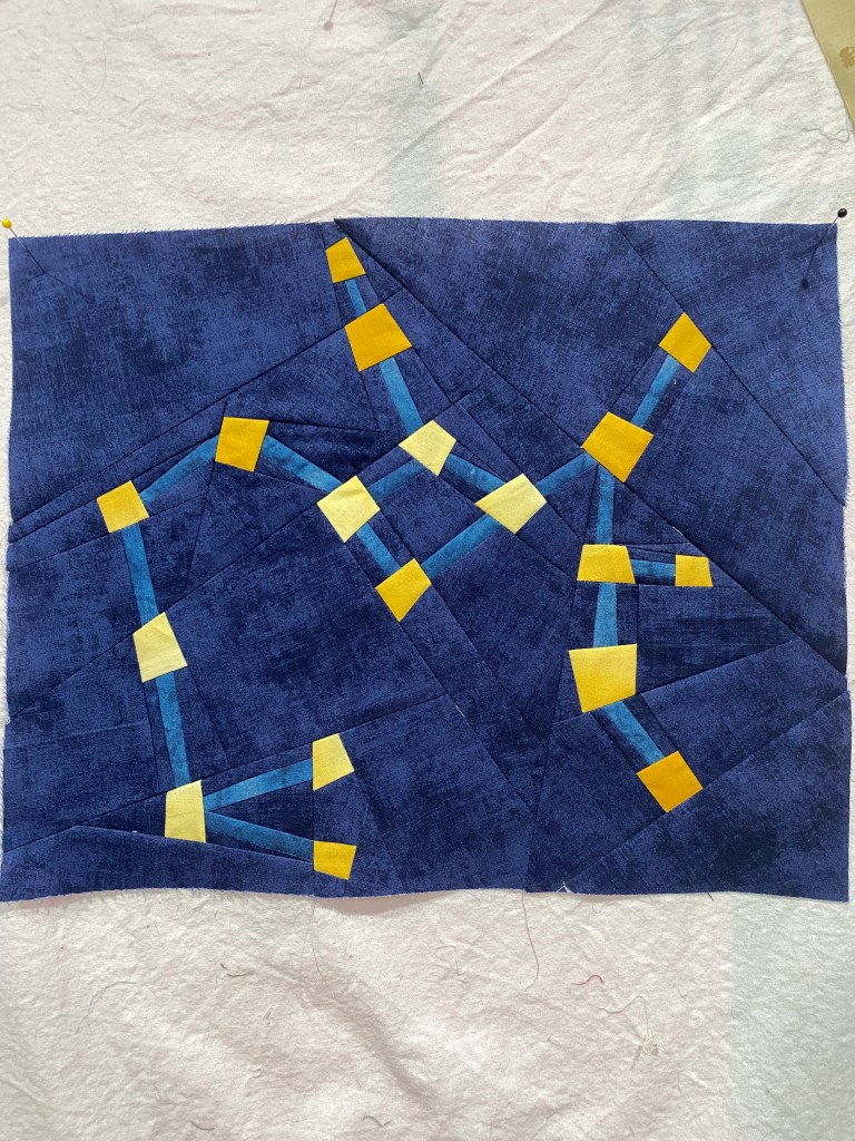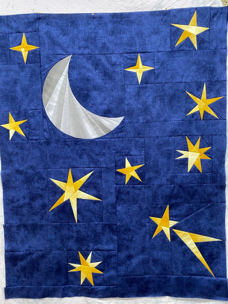 So (sew) many stars. The past few days, except yesterday, I worked on getting the Starry Signs BOM, from Whole Circle Studio together. Sunday and Monday I made the last monthly block, Sagittarius, and all the center stars. Thankfully I had the moon made, and the single stars were relatively easy compared to the constellations. In preparation for the queen sized quilt, one must first make the throw sized version. Then add three more borders to make it into an 88 inch square top. I am at that point right now. I need to set aside a day for making six more stars and the mountains. I did end up replacing the dark pinks I originally bought with two slightly darker shades. When I first started this quilt I purchased a ten yard bolt for the dark blue background fabric. I have about two and a half yards left, the pattern calls for about 11 yards for this version. I am wondering if I should order another yard or two to finish, I could use extra for binding.