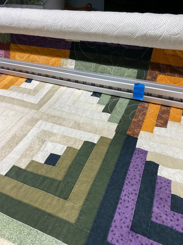 I got the Log Cabin quilt loaded and started quilting it. I picked a feather panto that covers nicely, not too dense, but it will hold this quilt together for another ten years.