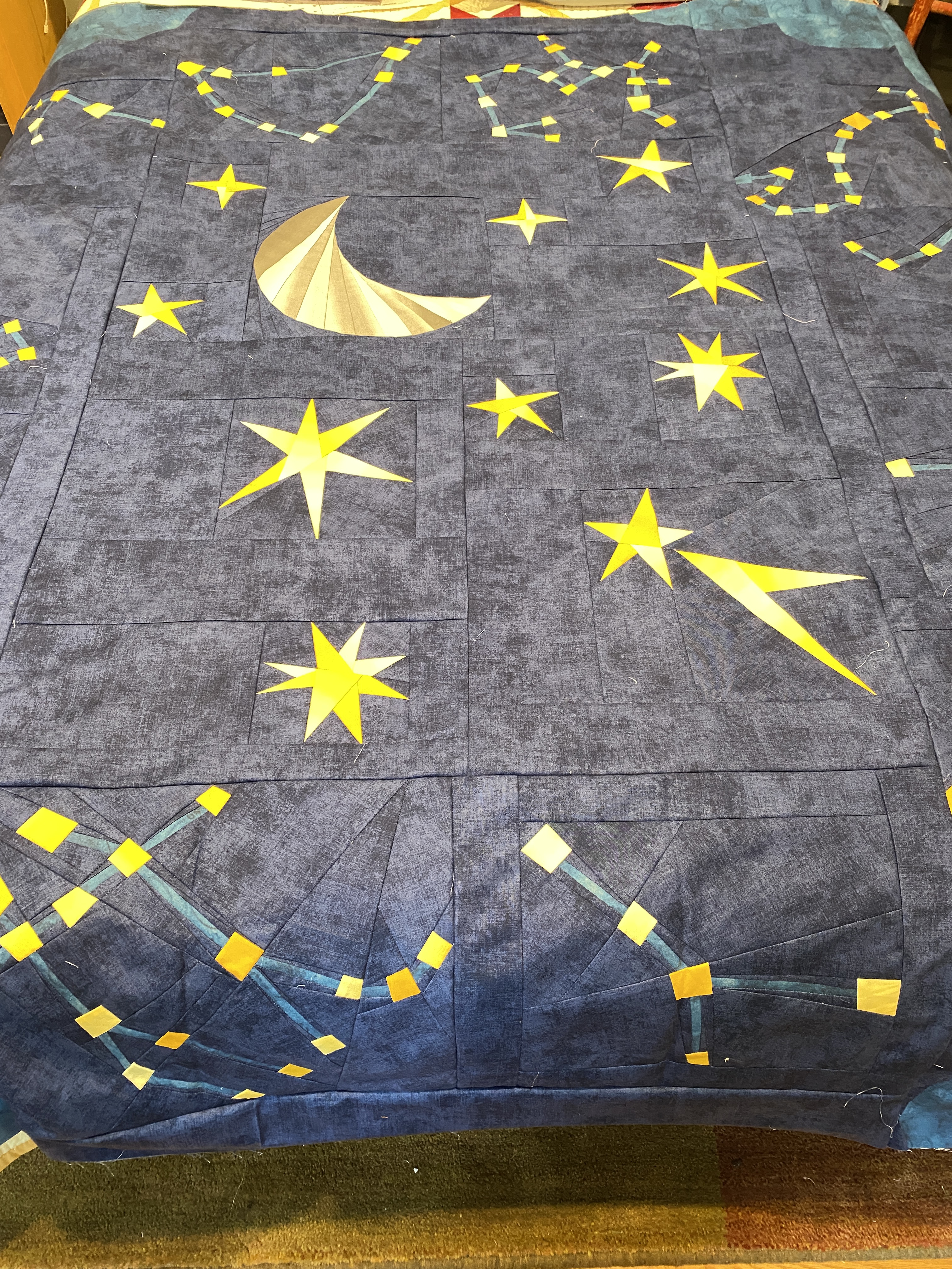 So (sew) many stars. The past few days, except yesterday, I worked on getting the Starry Signs BOM, from Whole Circle Studio together. Sunday and Monday I made the last monthly block, Sagittarius, and all the center stars. Thankfully I had the moon made, and the single stars were relatively easy compared to the constellations. In preparation for the queen sized quilt, one must first make the throw sized version. Then add three more borders to make it into an 88 inch square top. I am at that point right now. I need to set aside a day for making six more stars and the mountains. I did end up replacing the dark pinks I originally bought with two slightly darker shades. When I first started this quilt I purchased a ten yard bolt for the dark blue background fabric. I have about two and a half yards left, the pattern calls for about 11 yards for this version. I am wondering if I should order another yard or two to finish, I could use extra for binding.