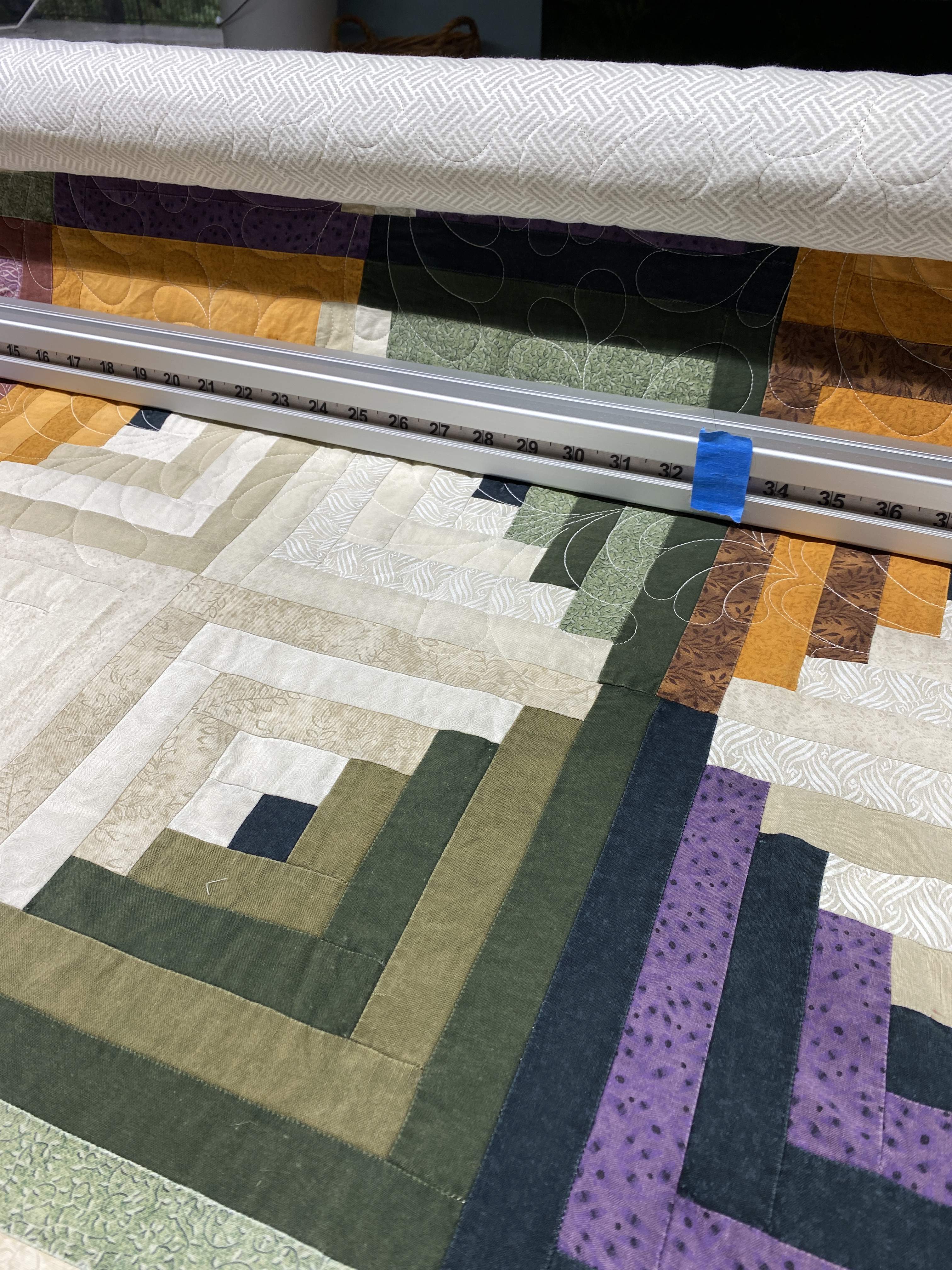 I got the Log Cabin quilt loaded and started quilting it. I picked a feather panto that covers nicely, not too dense, but it will hold this quilt together for another ten years.