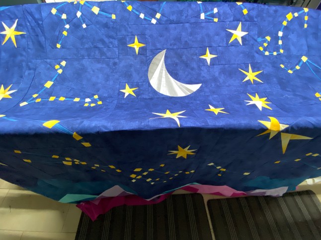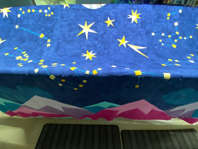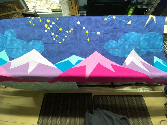 I got a lot of sewing in yesterday, finished up the Starry Signs quilt top. It took me about eight hours on Monday to stitch the mountains section. You would think that these large size PFP pieces would be easy, but I found some difficult to wrangle and there was a bit of ripping involved. Whole Circle Studio has a good video on how to make large size FPP blocks on YouTube. It also helped that I precut all the pieces before hand. Usually I just cut strips and use them as I go. I am not sure how I want to quilt this yet, maybe part manually and part Qmatic. I was thinking of adding lines to the mountains to give them a bit more texture. Adding swirls to the clouds too, but the sky is so dark I think any custom designs would be lost. The original quilt has ½” spaced horizontal lines, very tedious to execute on a 88″ square quilt. I am really happy to finish up this BOM, and I can start something new.