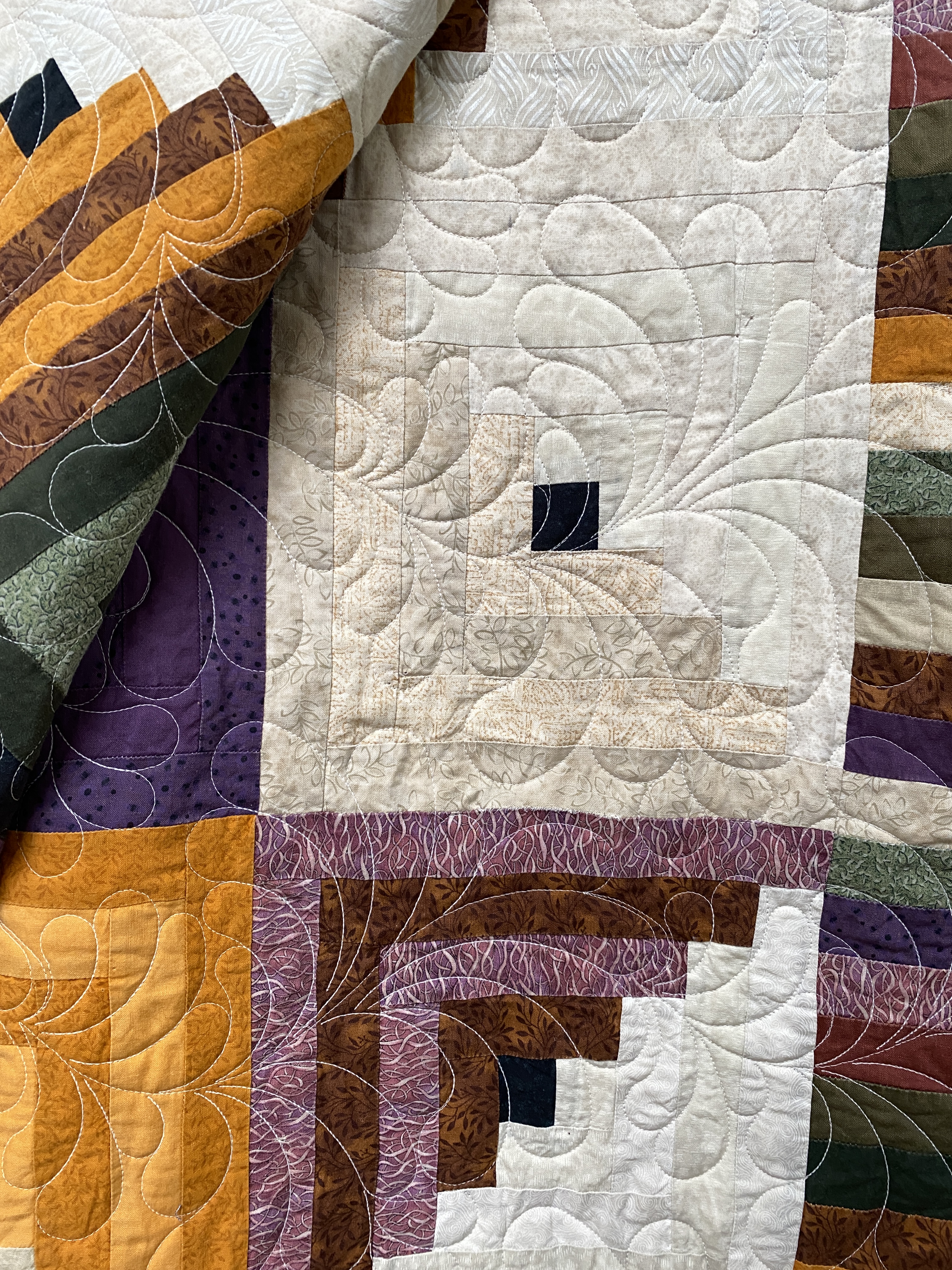 I also finished the Log cabin re-do quilt. I made the binding slightly larger than usual, 3″ wide. I sewed it to the back with a 3/8ths inch seam, so when it was folded over, it shows 5/8ths on the front. I am really happy with how this came out, and will be returning it to the happy couple tomorrow.