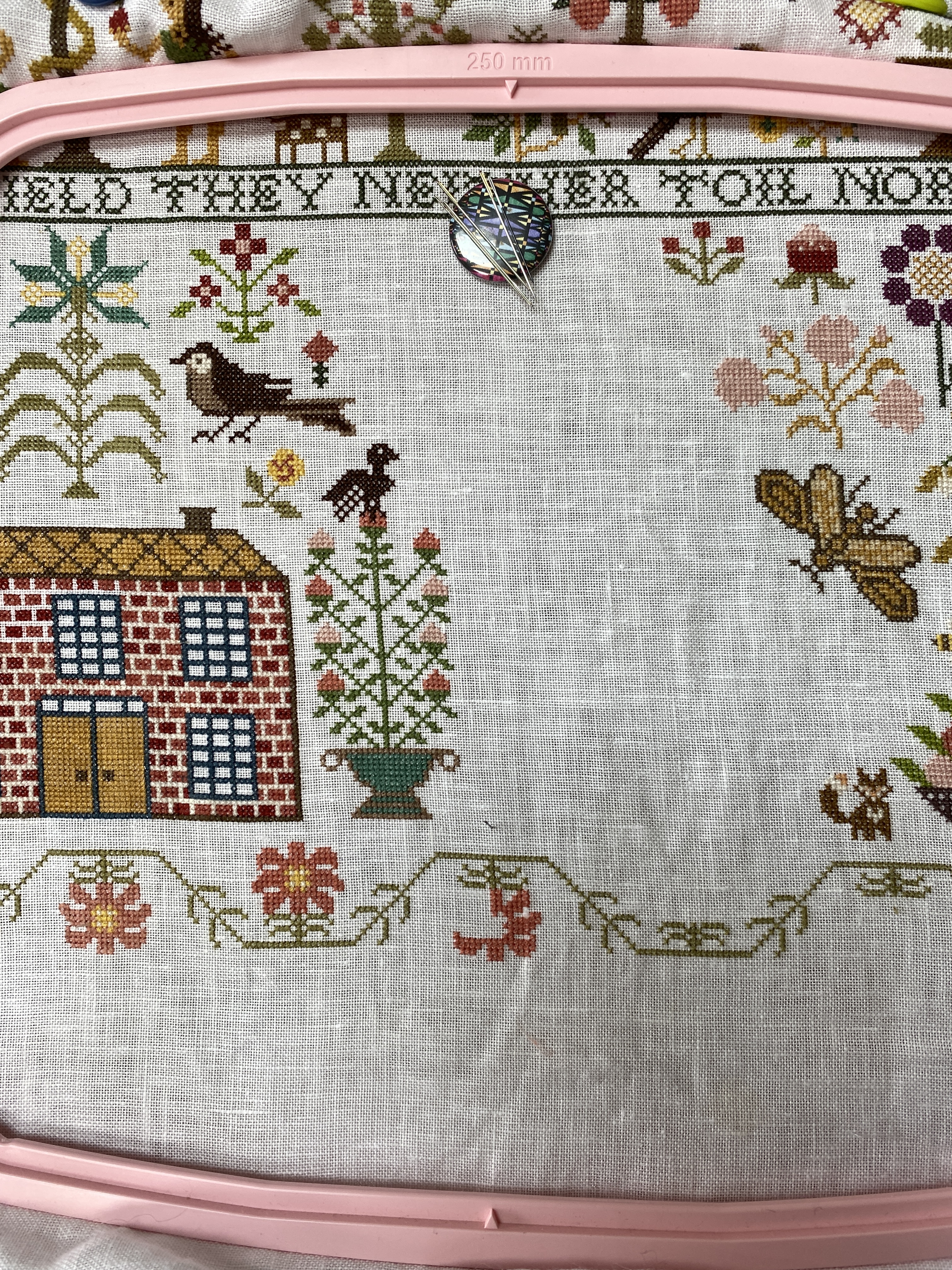I was reading through Jo’s Country Junction the other day and she showed a new sampler from Heartstring Samplers called All things Wise and Wonderful. It’s going to be available at Nashville this coming month. I wish it had been around before I started the Lilies, I like it so much more. I doubt I will do another huge sampler of this type again. I would rather do a Long Dog Sampler, if I am going to invest a years worth of stitching. I really want to start a smaller piece – must be strong and finish Consider the Lilies.