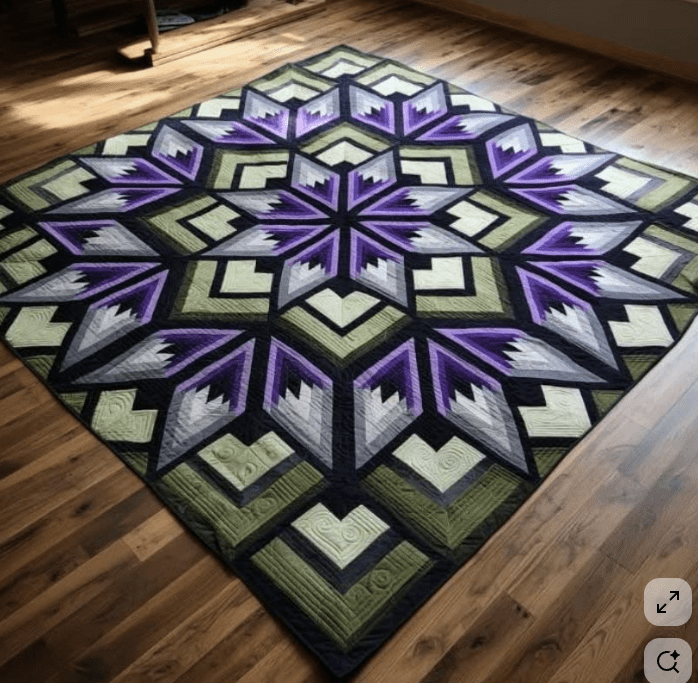 This week I want to get a good start on the Starburst Quilt. It is a paper foundation pattern, yesterday I spent some time printing the papers for the 32 log cabin diamonds. The version I want to make is purple and green, similar to the one pictured in center. I have all the fabric, I just need to take the next steps and get the pieces cut. I am hoping to use my Accuquilt 1 ½ ” strip cutting die for this. I foresee lots of assembly line sewing in my future.