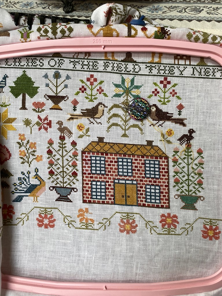 I am still stitching away on the lilies, I am almost done with the border lilies, there are a few on the other sides of the border that need the yellow added to the centers. The mortar on the house is almost done too. I think I am going to start the Mirabella mermaid stitchery next. I got the pattern in April of last year, and recently found all the threads and beads needed for it. Maybe if I kit it up, I’ll have even more incentive to finish the lilies. On a sad note, the art and framing store where I got my last huge cross stitch piece framed, is closing. It was a great resource for art materials, paper, pens, paints as well as framing. It was family run for decades and a beautiful and well stocked store.