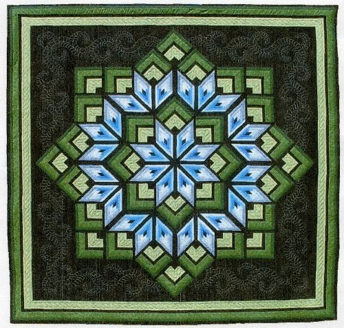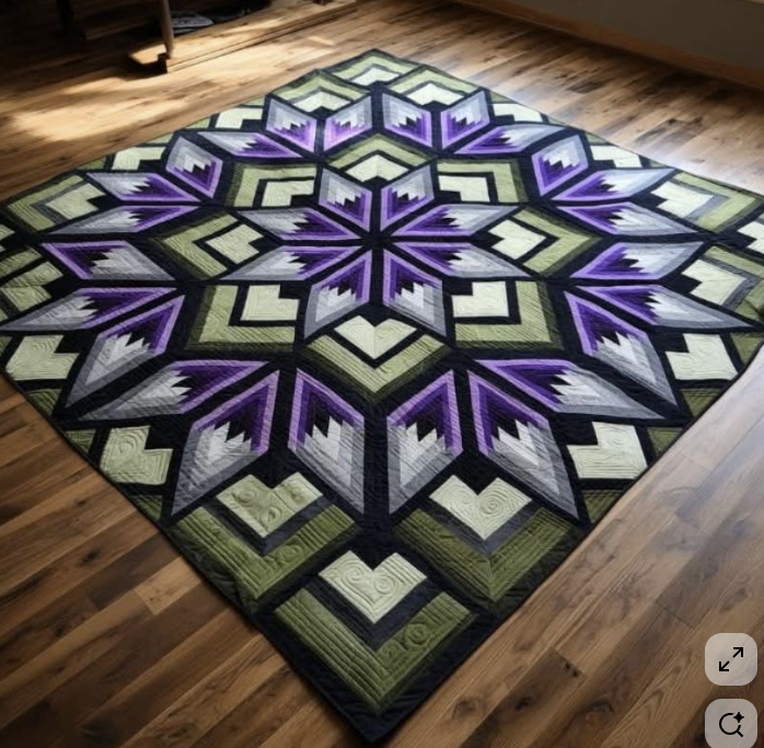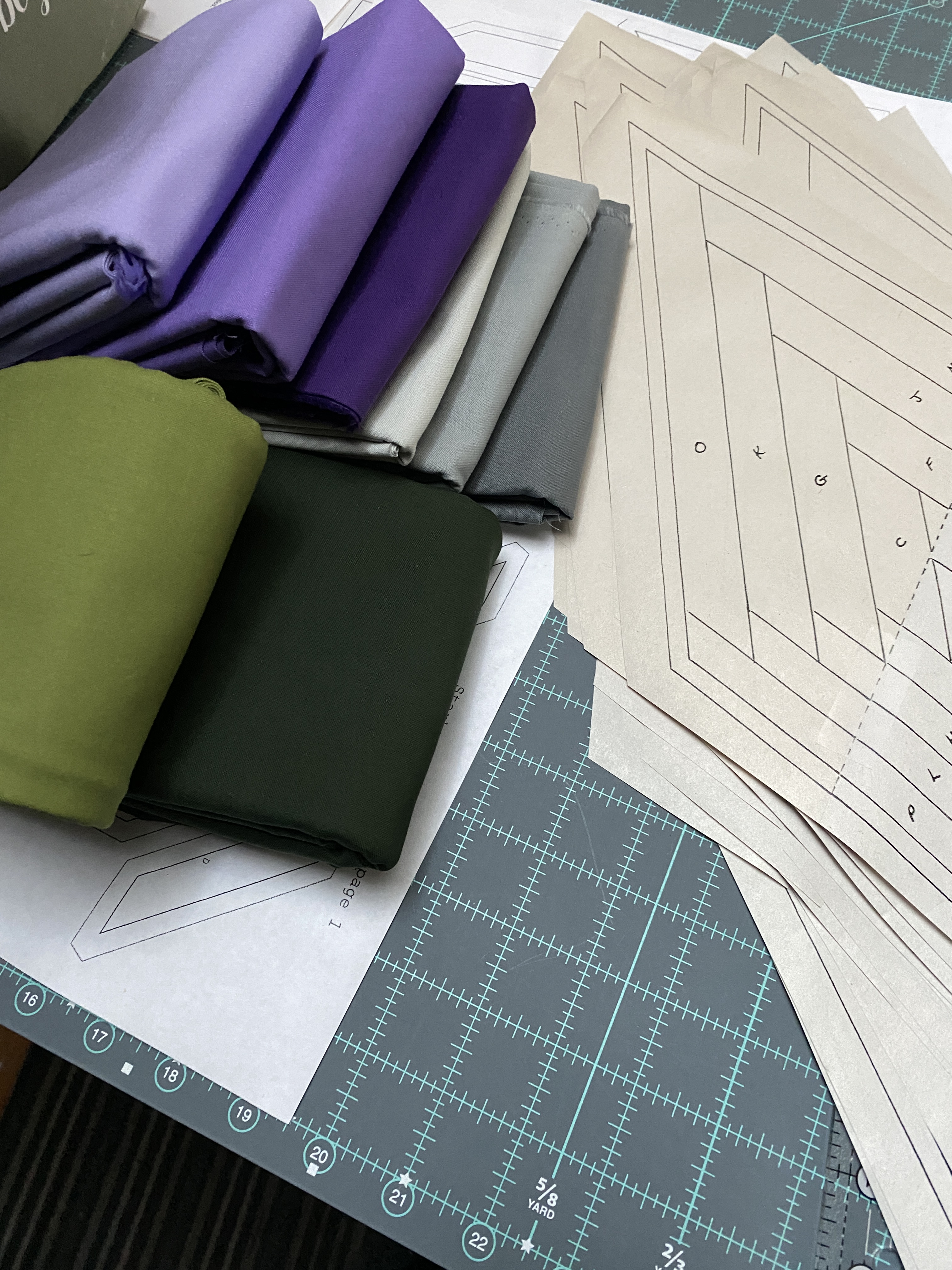 This week I want to get a good start on the Starburst Quilt. It is a paper foundation pattern, yesterday I spent some time printing the papers for the 32 log cabin diamonds. The version I want to make is purple and green, similar to the one pictured in center. I have all the fabric, I just need to take the next steps and get the pieces cut. I am hoping to use my Accuquilt 1 ½ ” strip cutting die for this. I foresee lots of assembly line sewing in my future.