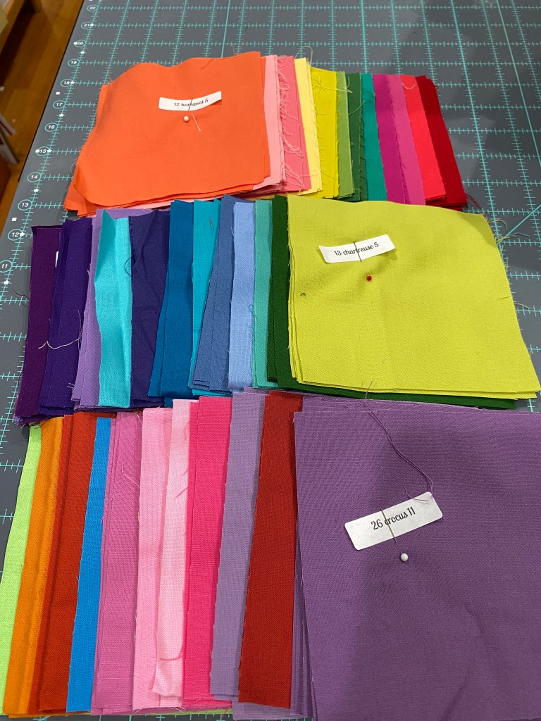 Once again I found I was in need of something simple to make. While sorting through my solids scraps and pieces (for the veggies) I realized I had enough colors to make a Postcards from Sweden quilt. I printed out the pattern and the colors needed and made up some stick on labels. I found each color, or its equivalent, cut the squares and labeled them. There are 36 colors of squares and I have them all ready to go. Also I neatened up my solid stash a bit, it now all fits in the bin. Then the squirrels popped up.