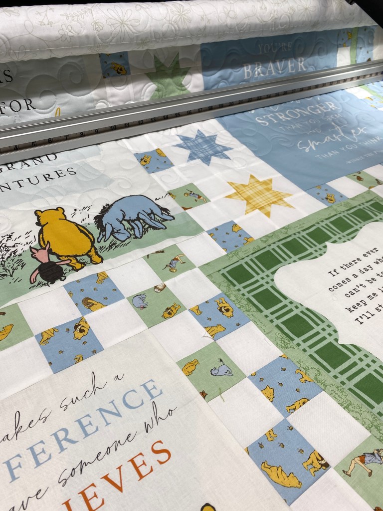 I started thinking about the up coming baby shower I will be attending soon. It’s for my nephew and his wife, their first baby and my first grand nephew. I thought I could give them the newly completed Thomas the Tank Engine scrappy quilt. I foolishly went to see their gift registry to see if I could get a feel for the colors/theme of the nursery. It is a Winnie the Pooh theme. I remembered that I had seen a cute baby quilt kit for the newish Riley Blake WtP fabric line. I found one and ordered it, along with a second panel, a 5″square pack and a few yards of coordinating fabric. I figured I could use the pattern to make another quilt for the shop while I was at it. The fabric arrived on Tuesday (a day early) and I had it all cut and ready to sew for the next day. This top went together with very little trouble, I had it loaded on the frame and quilting by dinner time. I’m going to finish it today, so it’ll be ready for Saturday.
