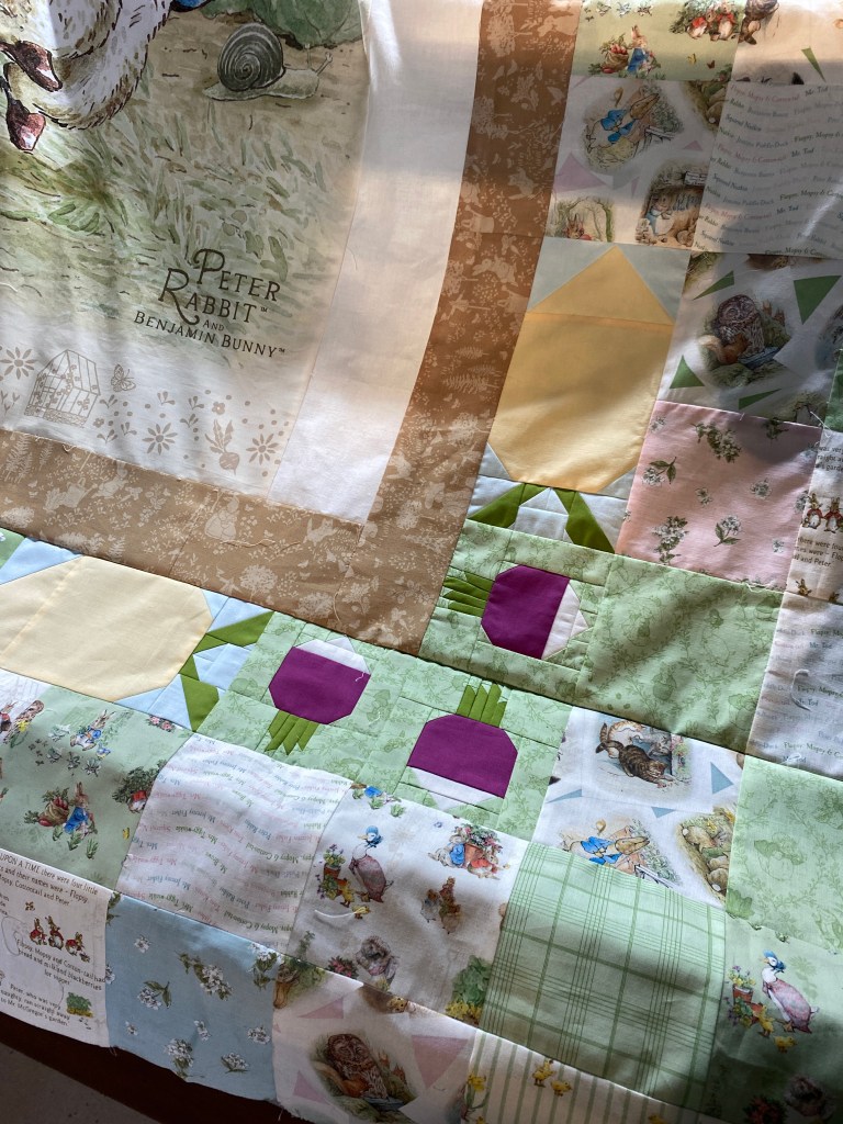 After finishing the Starburst top I really needed a palette cleanser, something with right angles and straight seams. I remembered I had one more Peter rabbit panel that I had bought to finish up all the scraps from the other PR quilts I finished last year. The panel arrived with a slit cut into the side of it. I couldn’t return it or complain because I couldn’t remember who I bought it from, or exactly when. I figured I had to cut it anyway and I could add another border. After carefully measuring and centering the panel I added two off white strips and started sewing the rest of the quilt top together. The blocks are 5 inch squares, and four carrots and six radishes. The veggie blocks were made using the folded corner technique and used solid colored scraps. Flash back to Awesome Ocean quilts. Those blocks took a few hours to make, especially the radish tops. The squares went together easily enough. It came time to put everything together and it didn’t work. My additional borders were too small. After much ripping and remeasuring I adjusted them and found that they were too large. More ripping and resewing ensued, for a total of four times – exasperating. This was supposed to be my easy no brainer project, I actually had to put it down and leave the room for a few hours. I did finish it the next day.