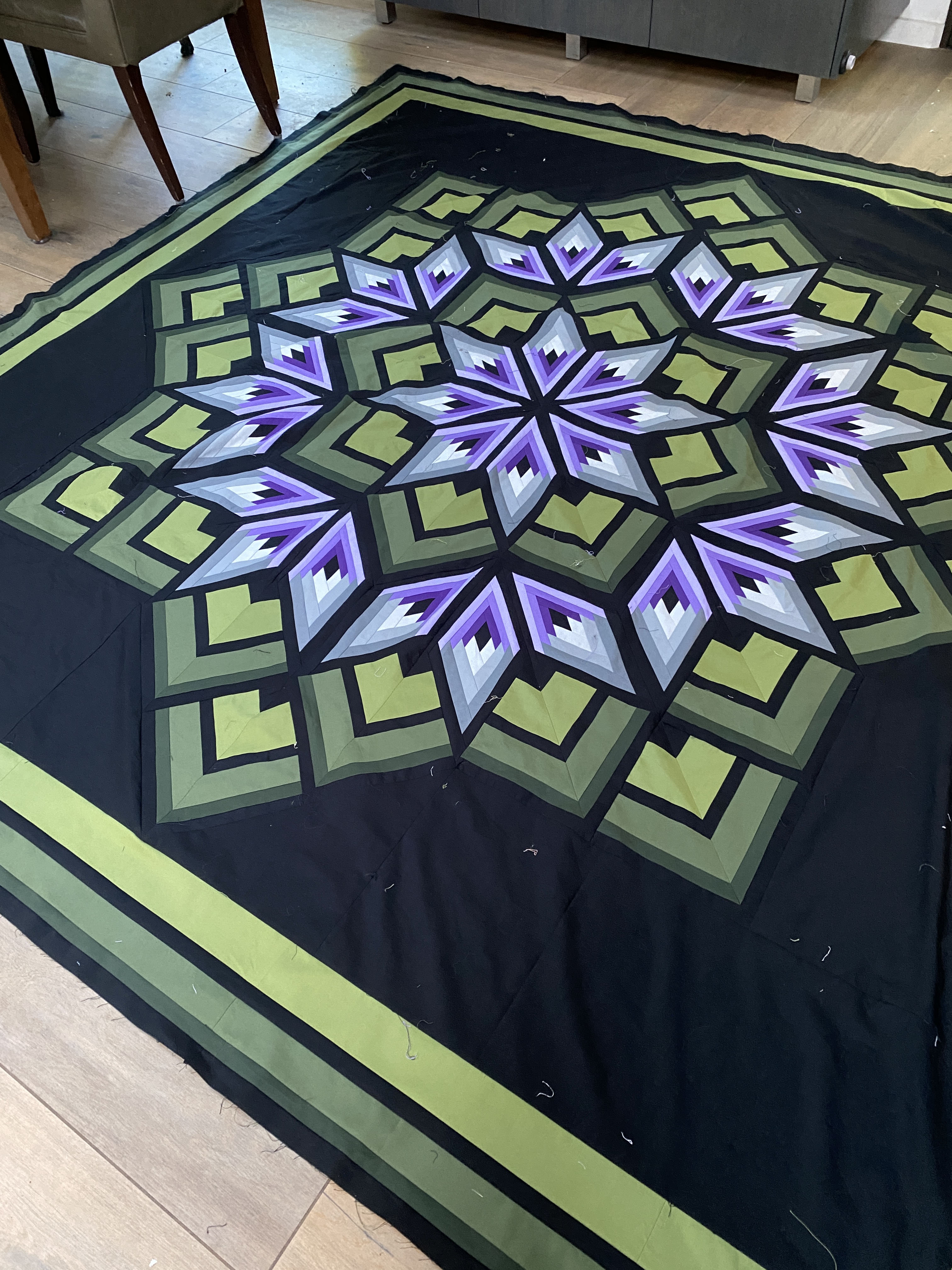 This past week has been one of lots of sewing, and lots of ripping. I managed to finish the Starburst top and get it ironed. It is neatly folded and waiting for its turn on the long arm. I received the ordered backing for it too. I had it relaxing on the frame for its pinning on, but had to refold it due to a different quilt that needed quilting asap.