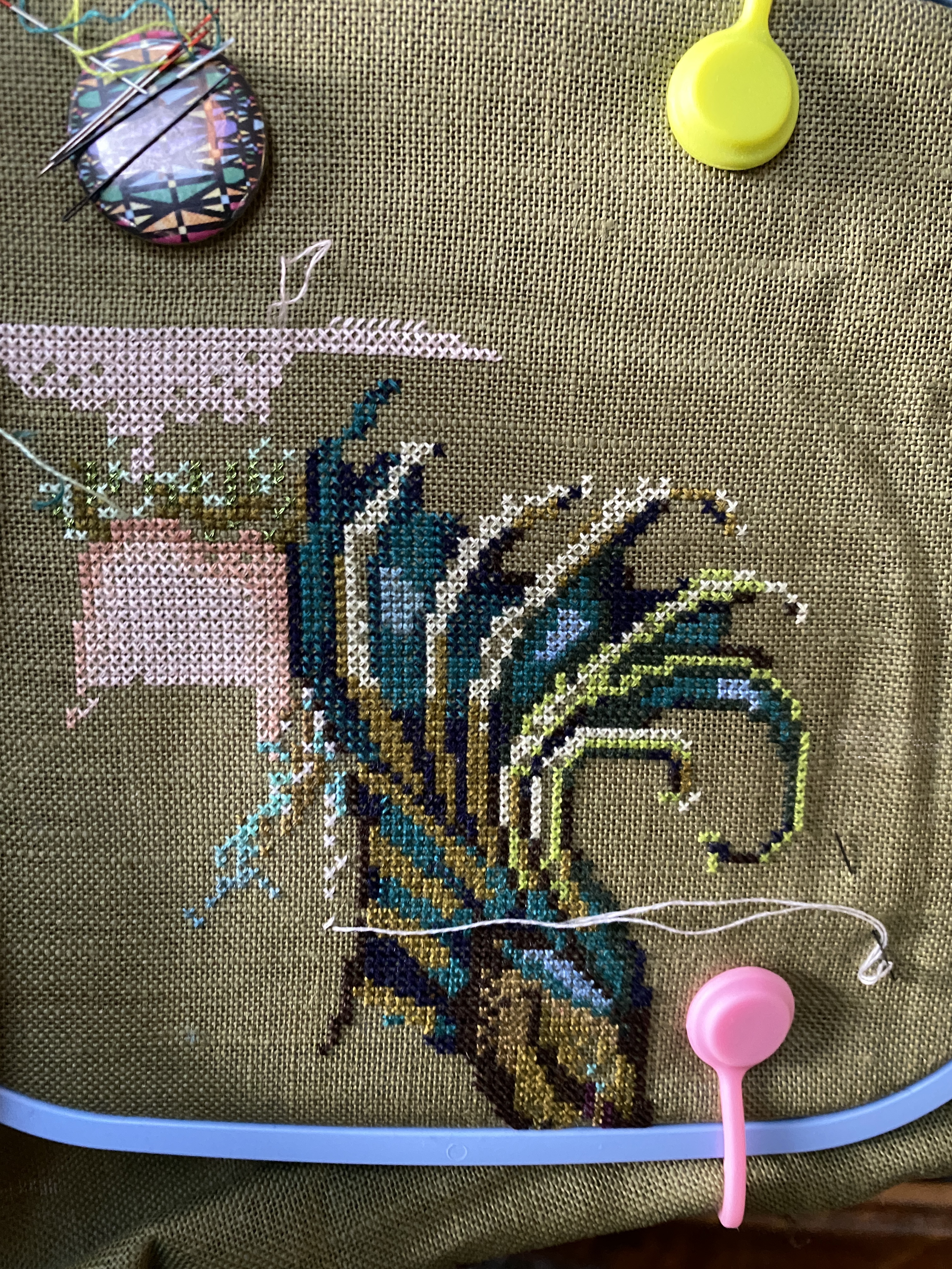 My stitching on the mermaid tail is continuing, I have been stitching in the day a bit more. Possibly to alleviate the stress of the quilt top sewing. The shape of the tail is really starting to look like something and it is getting easier to add too. I use a disappearing marker to highlight stitch symbols to help with the confetti areas.