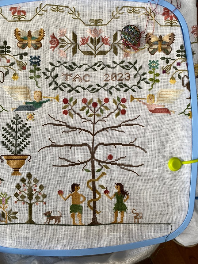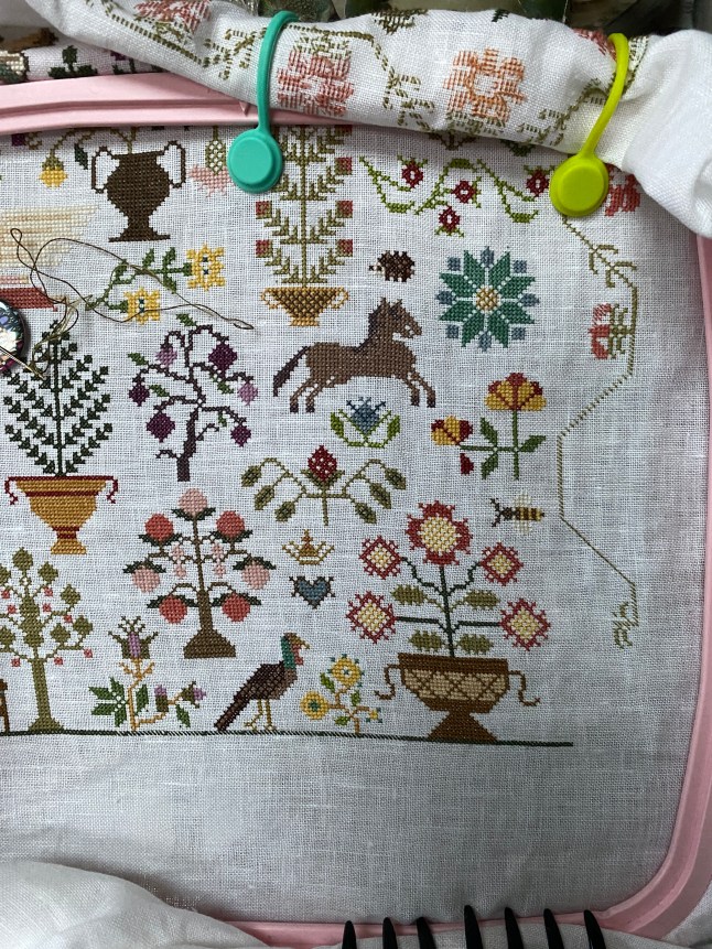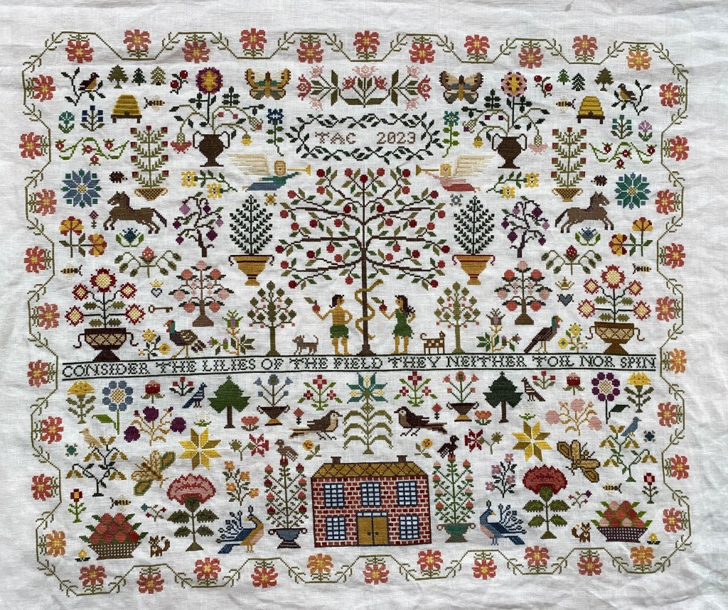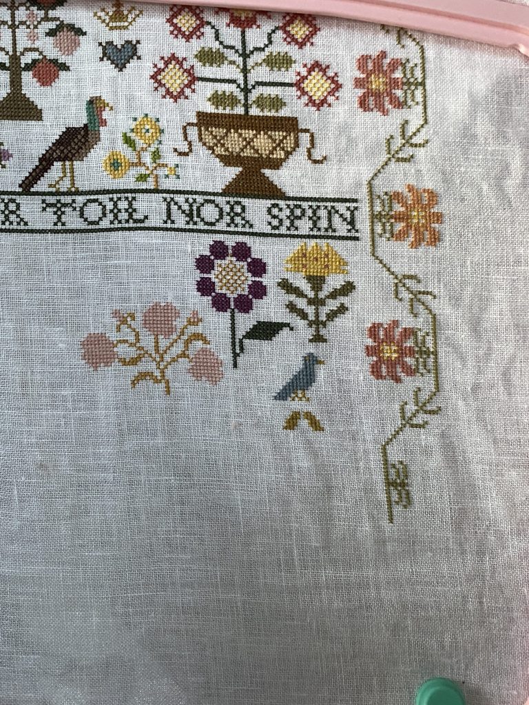 I have been steadily working on this since restarting it last May. I put it aside for June and July to do a Birth Sampler. Then restarted with the intent to finish by the end of 2025.