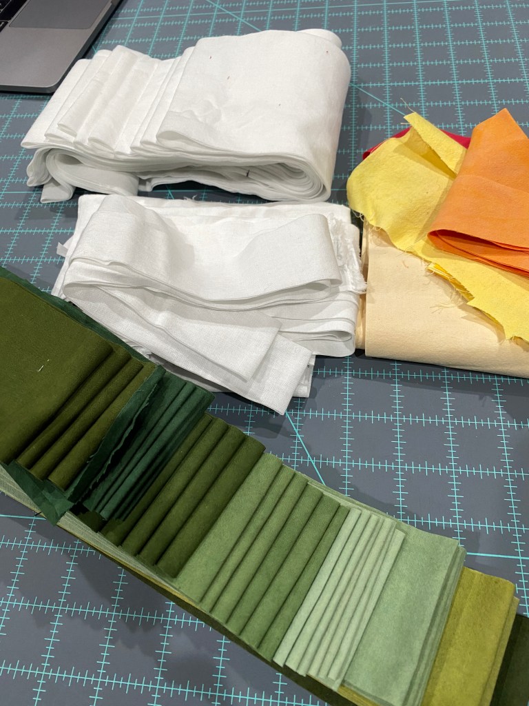 Facing a cleared off cutting table had me thinking of starting one last Christmas quilt. The Winter Visit quilt, which is a QAL with Krista Moser. I had been too busy to start it a few weeks ago, but I got all the strips cut for the background and bird last night. I needed 34 green strips to make all the wreath blocks. I ironed all those green pieces, and had them ready to cut today.