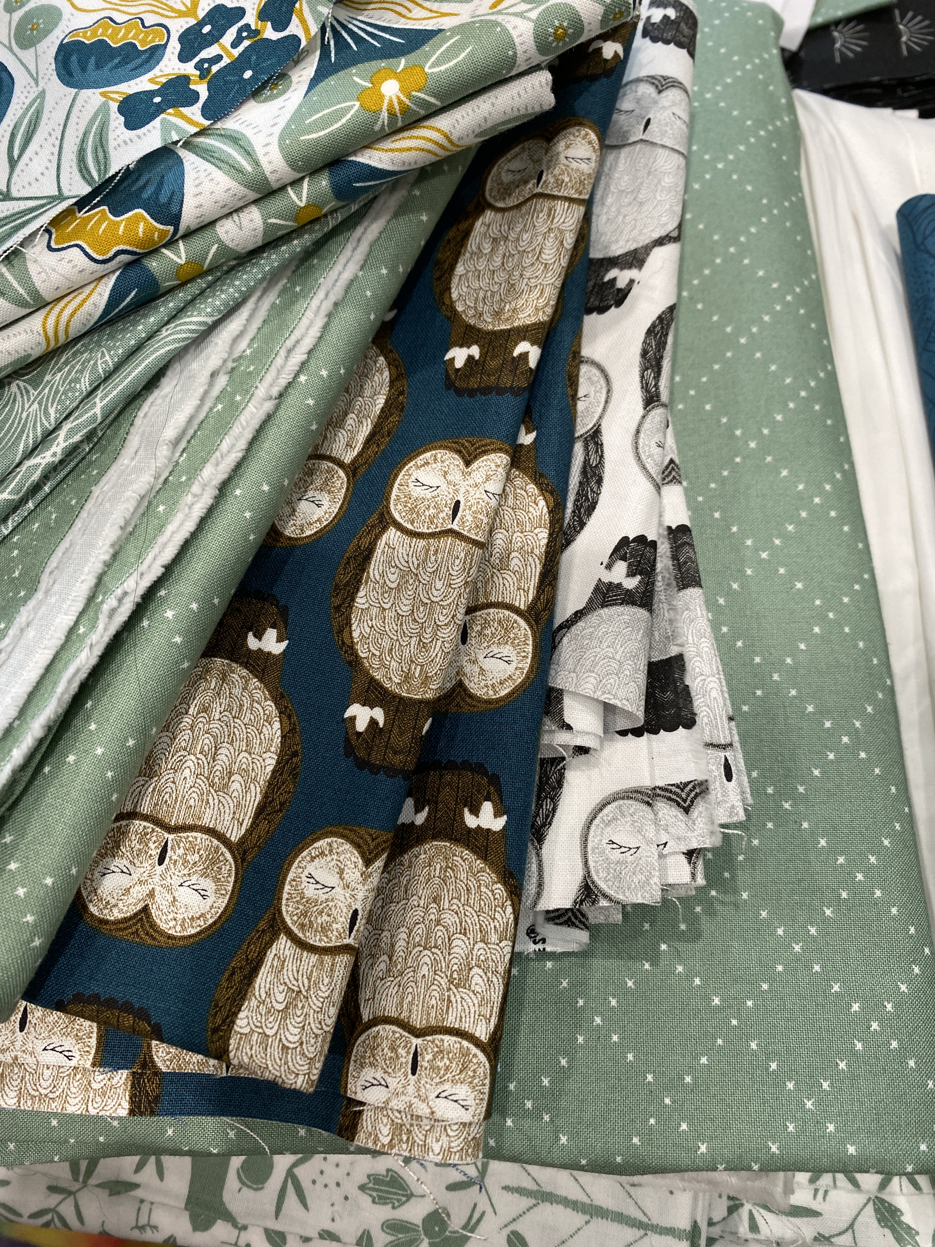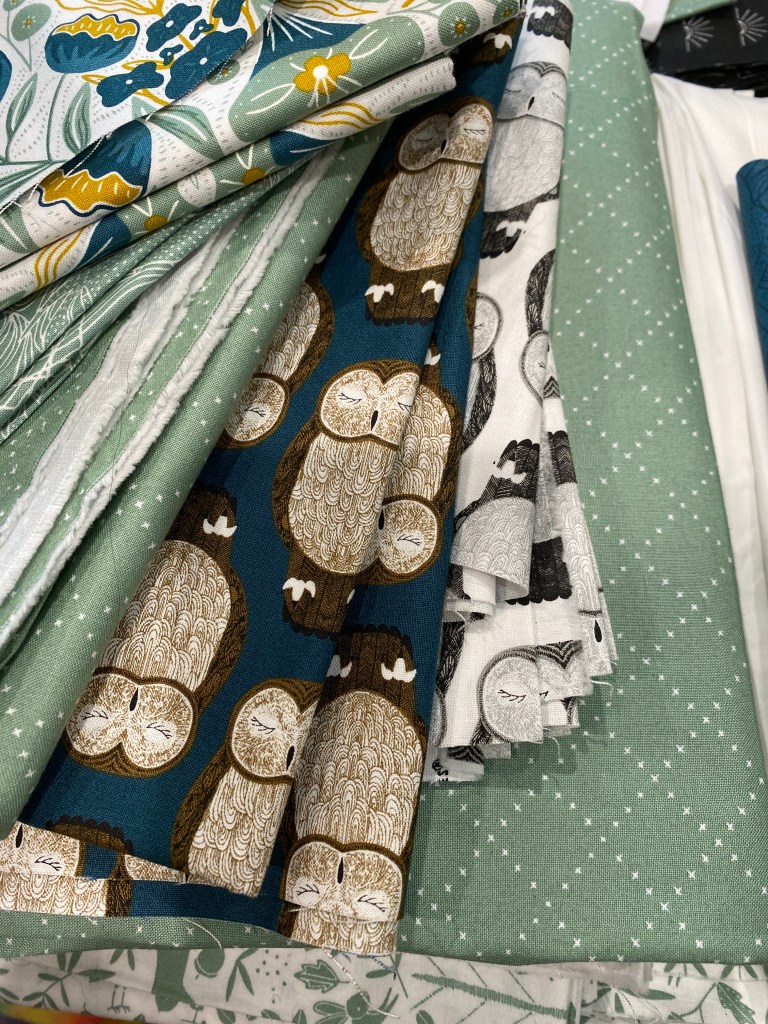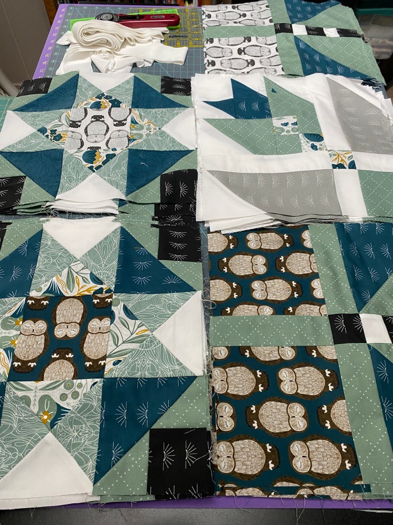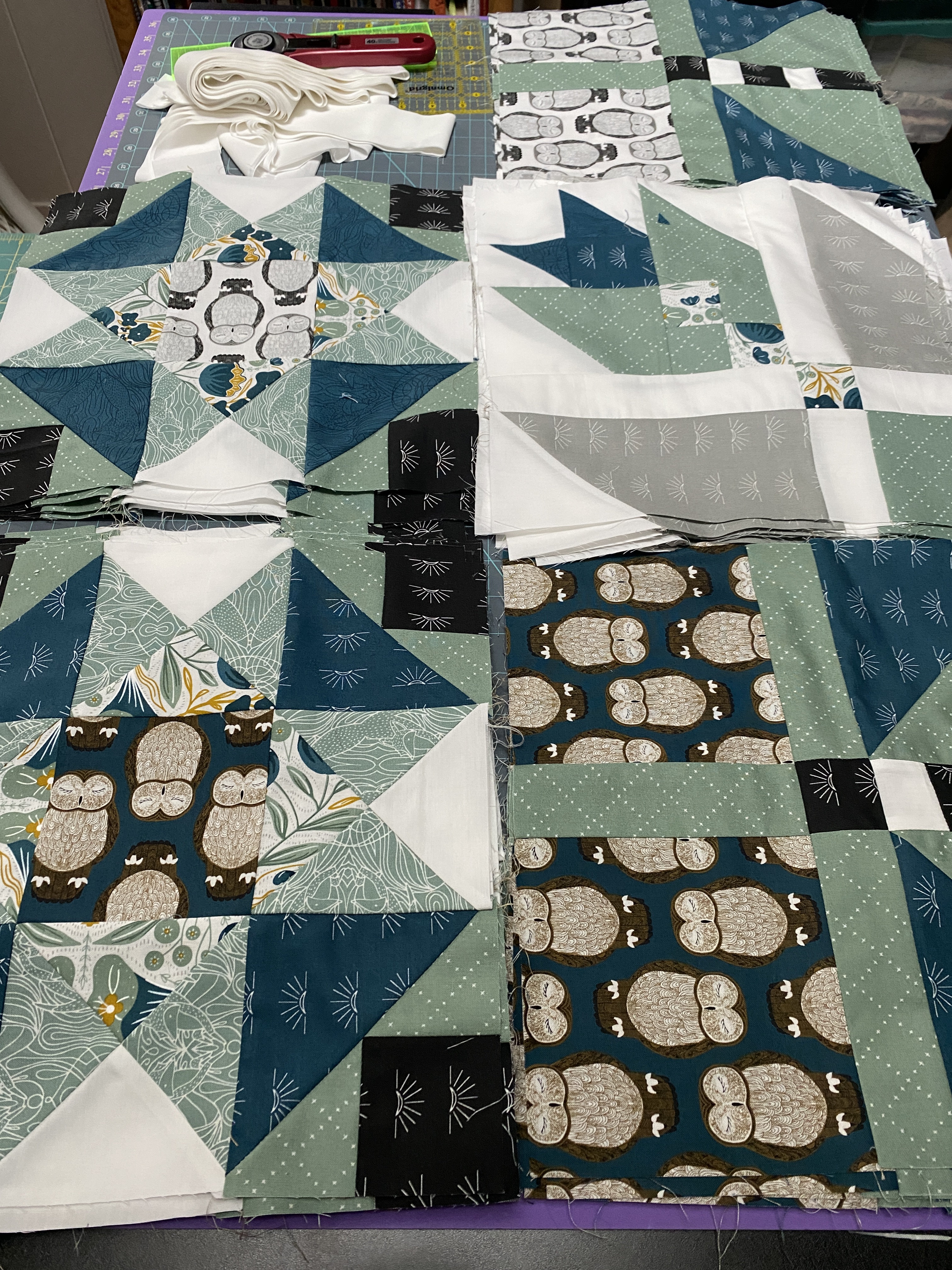 I did get all the sashing and rows put together for the queen size Aegean quilt yesterday. Now just five long seams until it’s a top. Might make this one the next long arm job. But I may just have to quilt the Reunion or A Ribbon Runs Through it quilt. Like I said above, some mindless set it up, and let it run for a row type quilting. I haven’t decided on a quilting motif for Aegean yet, I was thinking of something owl related. Of course, this would entail shopping, as I have no owls in my collection. I did get 75 new digital quilting designs from Bernina when I updated. I’ll have to look through those, there are some interesting full block ones. I have an idea to use three different ones on the three different block styles. Then the two inch wide sashing would have to have something in it. Must ruminate more.