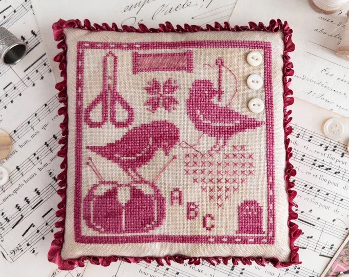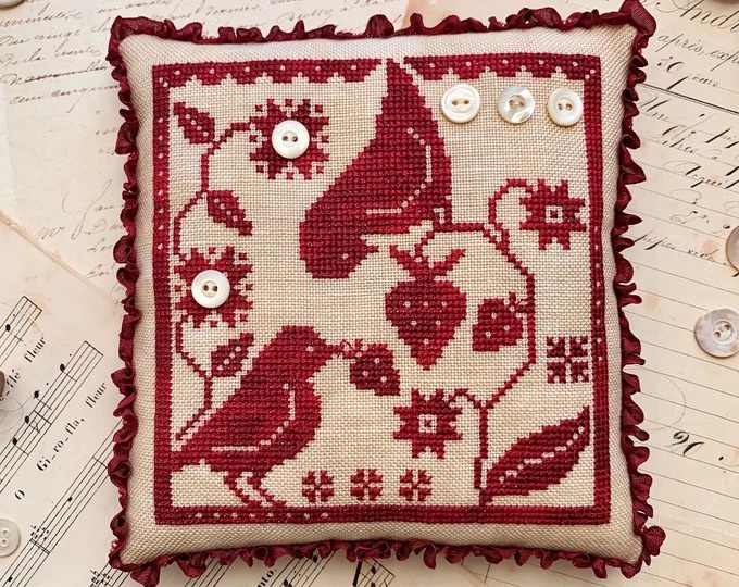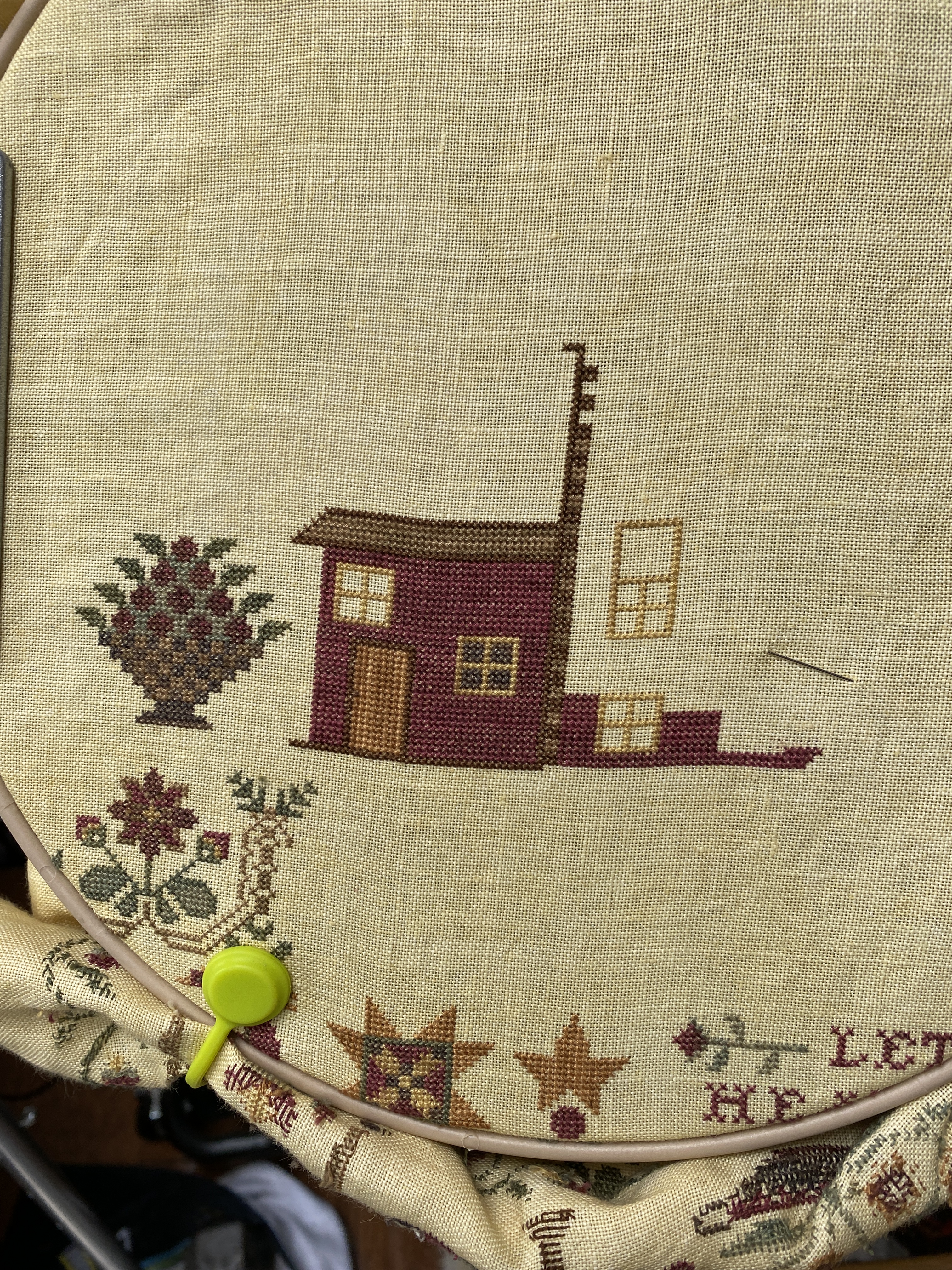The current cross stitch project, Heaven and Nature, got a few more motifs this week. I worked on the house steps and door, the flower border and a bird on the roof. Speaking of, we were awoken this morning by the sound of these two landing on the roof, not the usual scampering squirrel sounds.