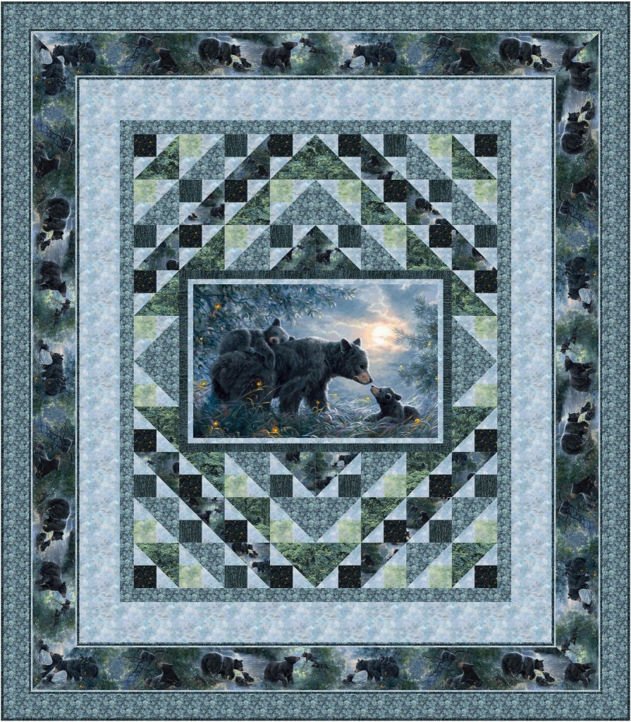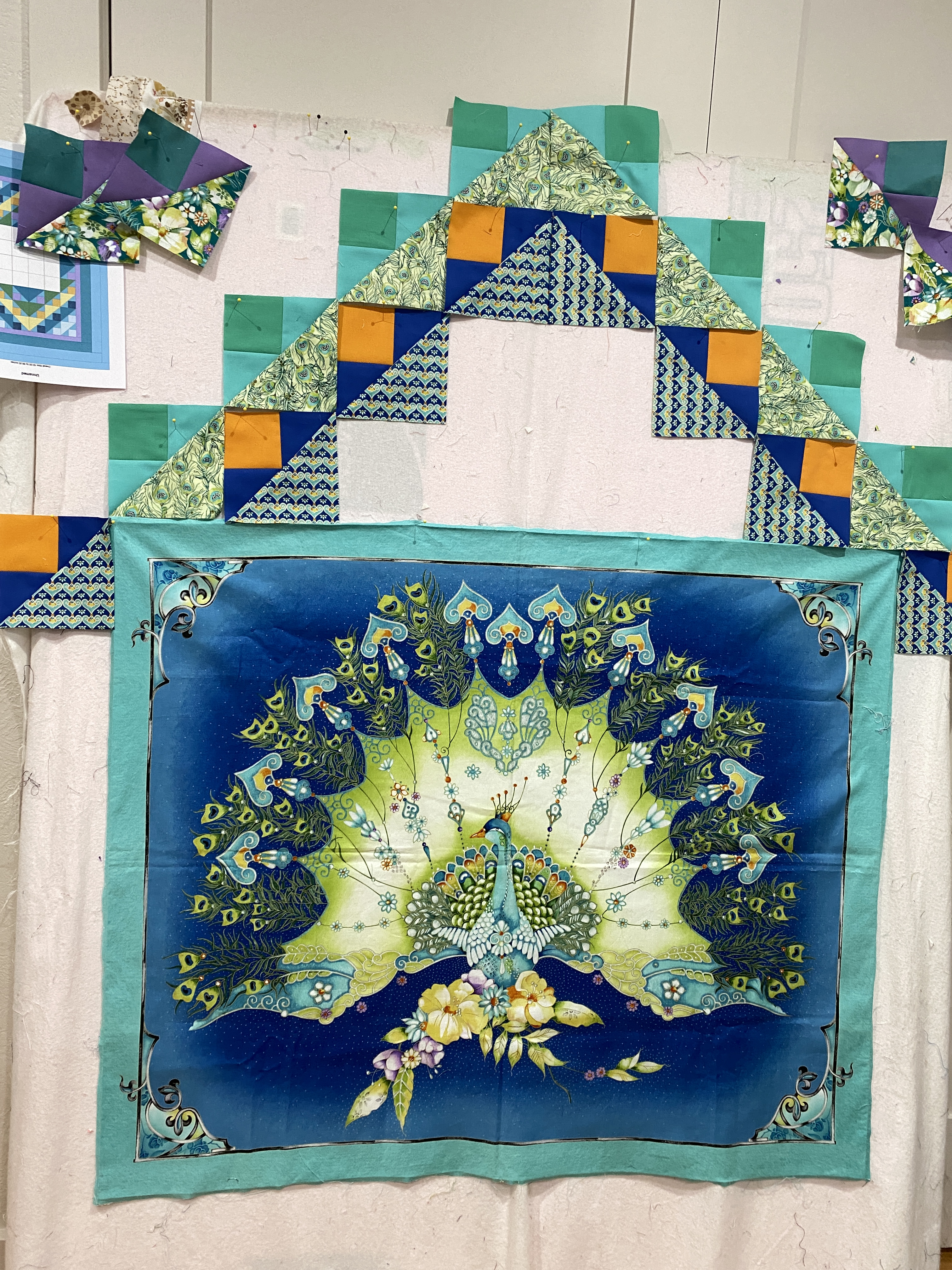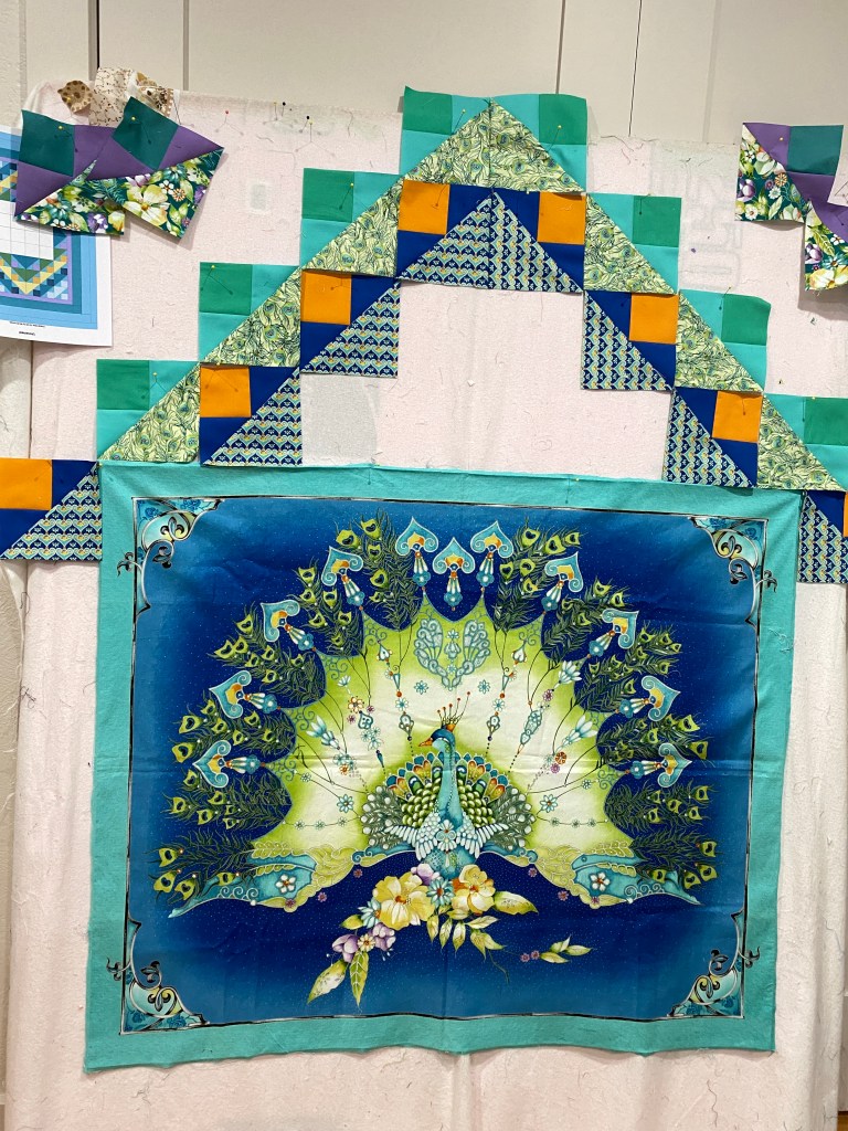 I have been working on the blue and green peacock panel quilt. I took it all apart and I am adding a different border. I saw this quilt pattern, called “What a View” and thought I could modify it for my panel. This is a horizontal panel, most panel quilts call for vertically printed ones. I’m using the Cats Cradle ruler from Creative Grids to make the blocks. It’s sort of a two at a time method like the flying geese two at a time one. Very little waste and they trim up square. These blocks are 5 inches finished size, and since I have a limited amount of matching fabric I am being careful. I may add some 4 patch blocks to fill and use the scraps I have left.