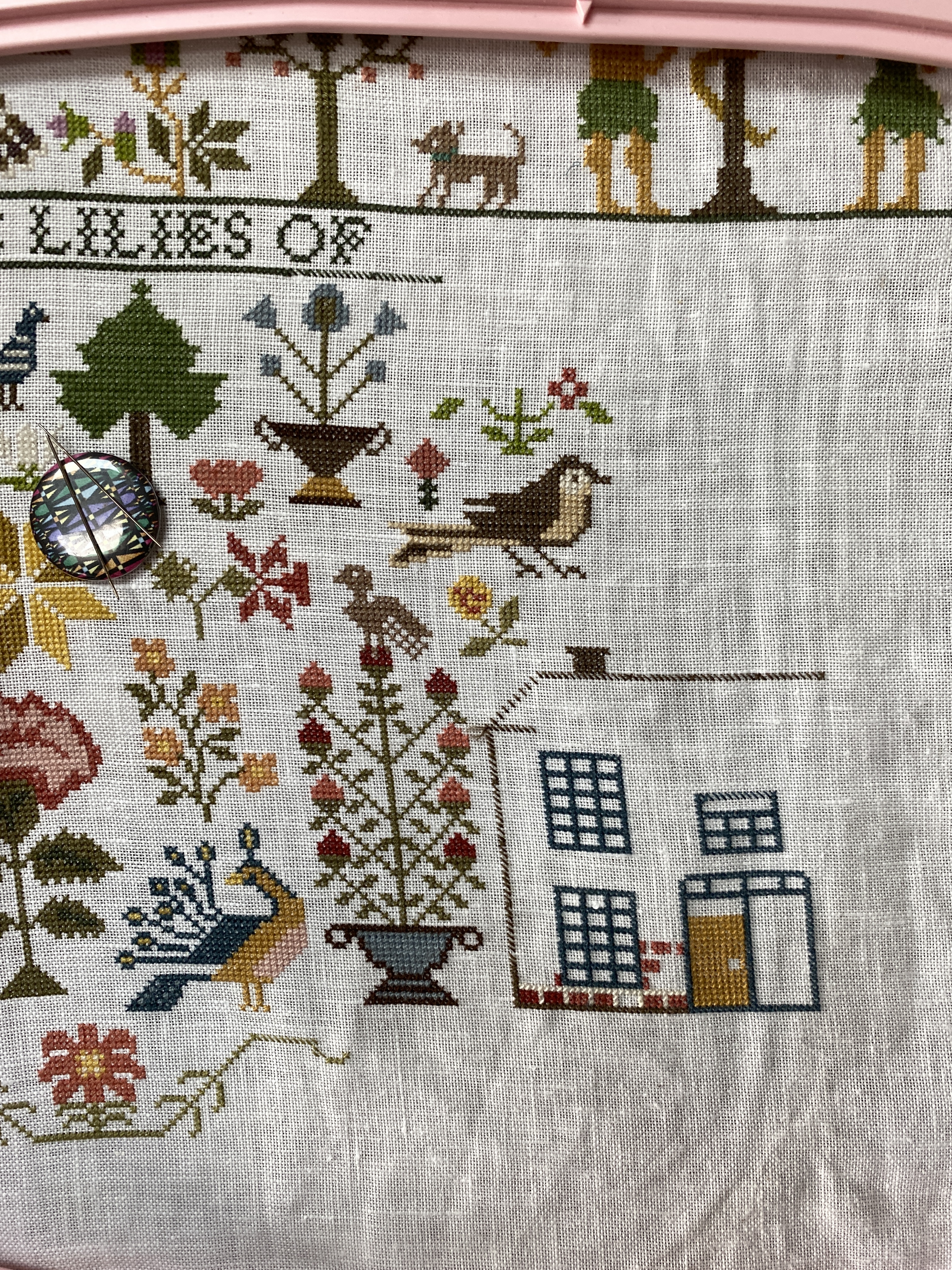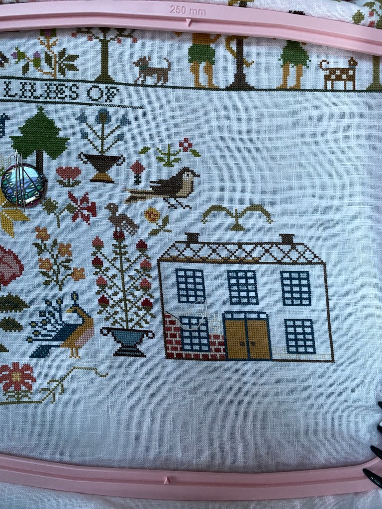 Cross-stitch land is gaining more X-es. I have the out lines of the house done and the windows and roof details. Lots of bricks and fill left. One night I skipped up and stitched the stem of the flower on top of it, to break up the monotony a bit.