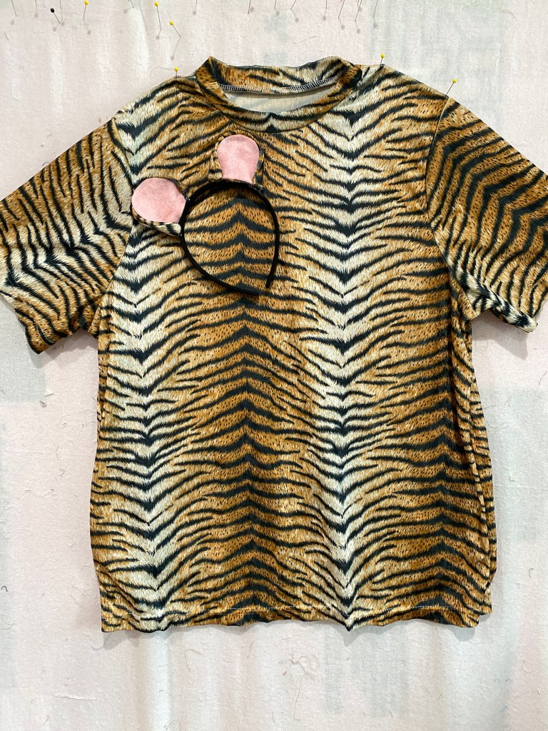 Last Wednesday I brought my machine in for servicing, the thread cutter was really getting on my nerves and the start screen telling me to bring it in for service everyday was worse than a “check engine” light. Before I went I checked for a “regular” fabric store in the area. There was one, Fabrics-R-Us, about twenty minutes south of the sewing machine store. I figured I would make a day of it, and hopefully find some leopard tee shirt material. I arrived at the sewing machine place and noticed that they still carried some clothing fabrics. I found a velvety knit Tiger stripe print that was perfect. I got two yards of it and went home, I really didn’t want to go to Fabrics-R-Us. I was able to cut and sew two shirts and a set of ears for the Saturday event. My friend and I were “Fabulous”, it was a good time and my friend loved her shirt, she asked to keep it for a Halloween event she has coming up. Yes, please, I am going to be stuck with two more yards of leopard print this week. I am thinking of a pajama set for me.