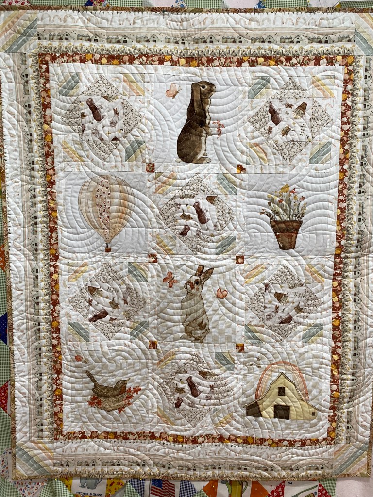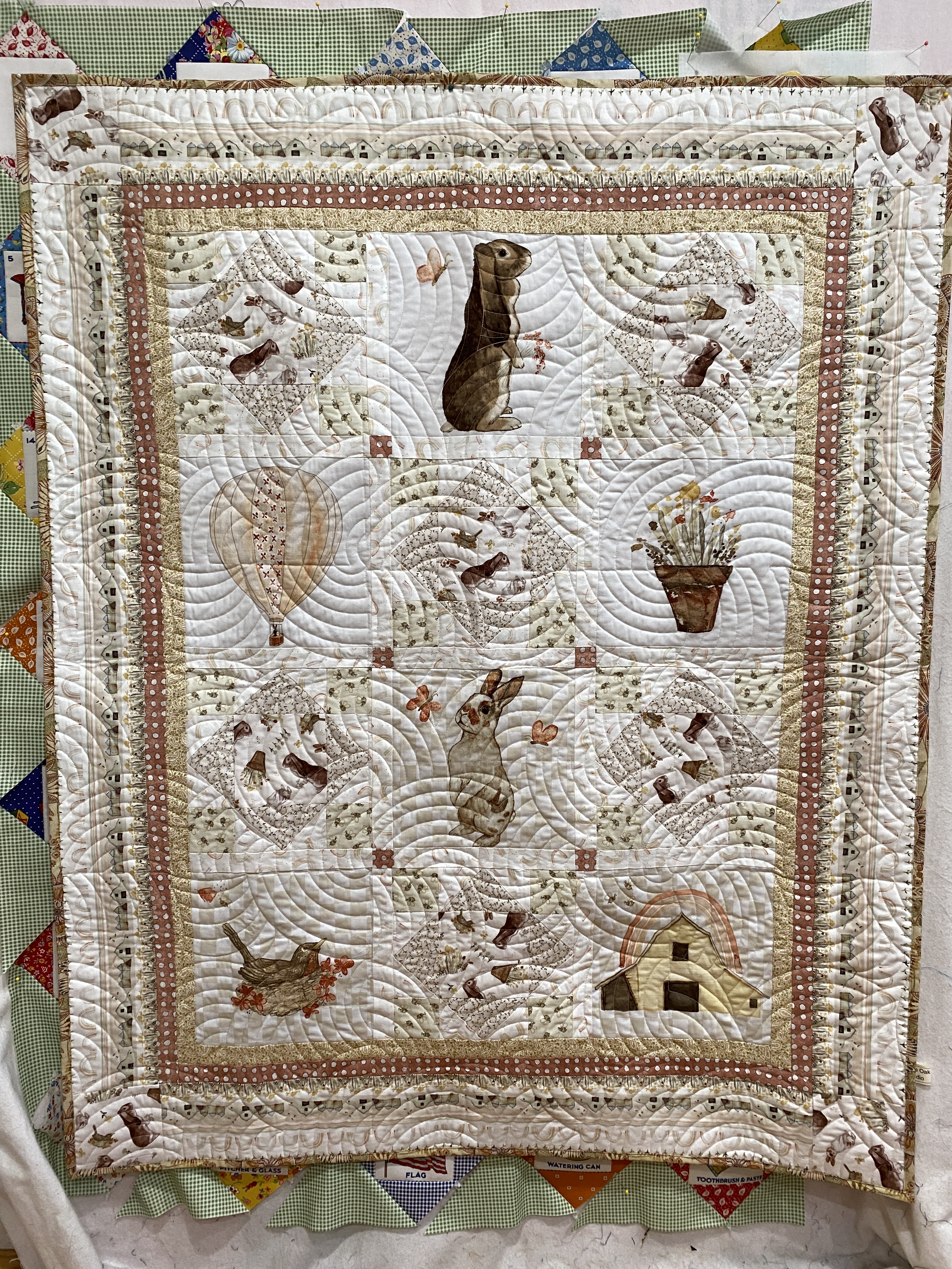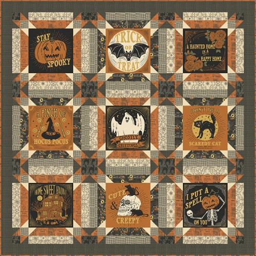 I found two more cute forest-y animal pantos for the last two Woodland friends tops. Got the first one done (bound too) and the second one is on the frame now. I got all the pieces cut for the next halloween quilt, a Pumpkin patch pattern from Cluck Cluck Sew. I have made three of these, sold two last year, and have one to quilt in the TBQ pile. I like this fabric line, its was on sale for less than 5.00 a yard and it has cats and cute halloween themed prints. Pink and orange, not my favorite color combo, but it works for this. I also got the fabric I ordered for the other Halloween quilt, the Witching hour, I want to make.